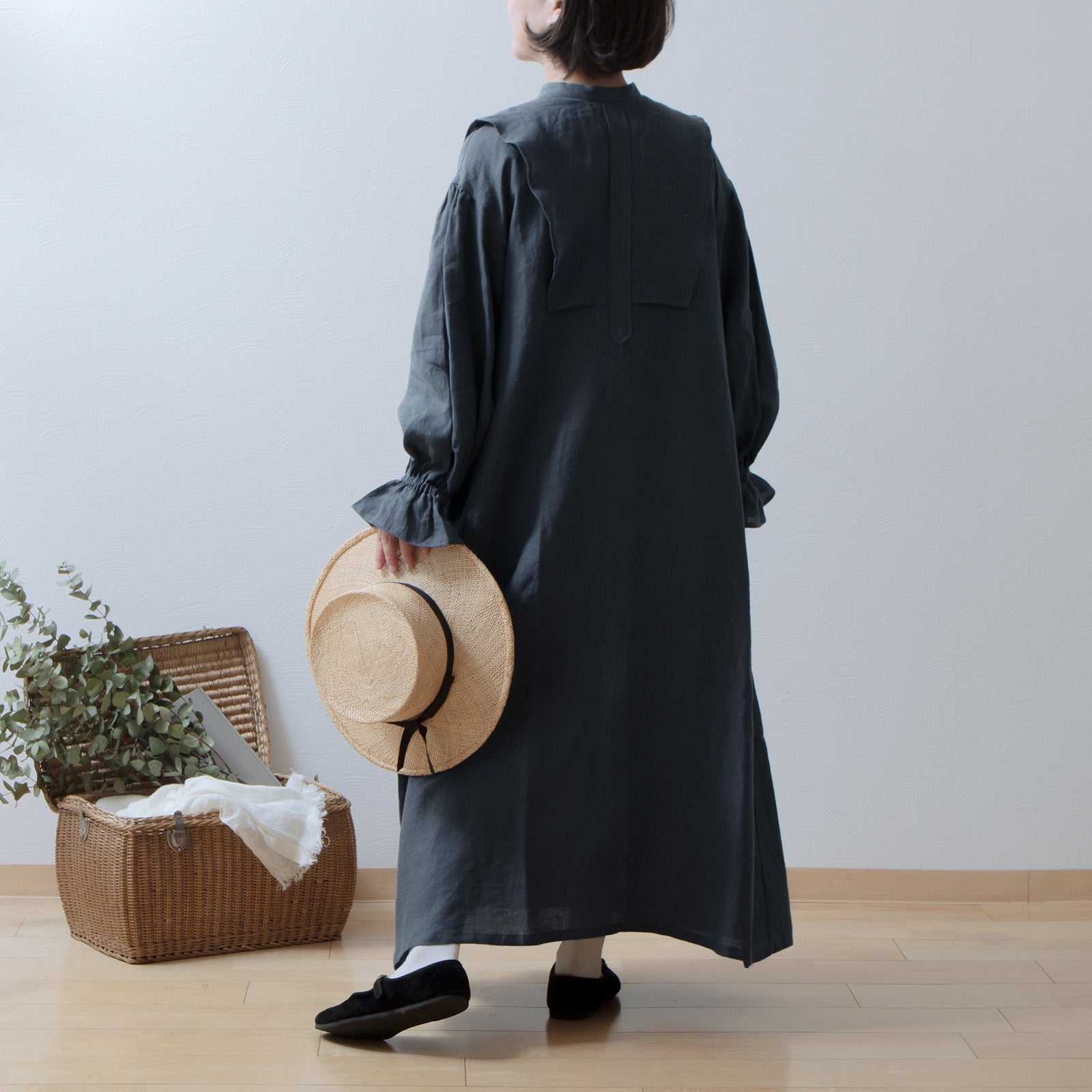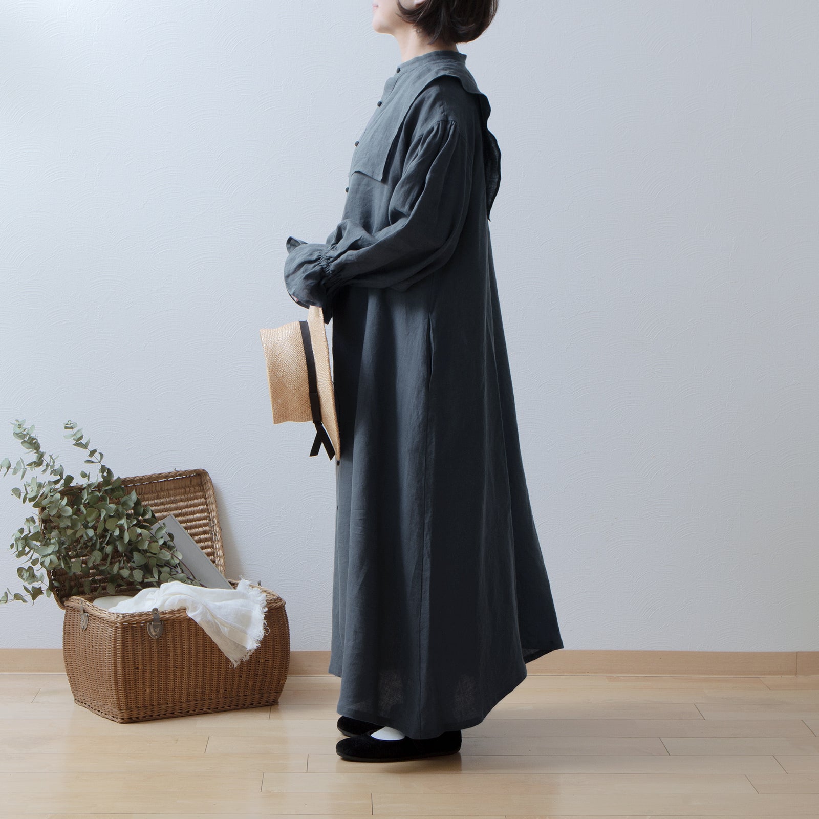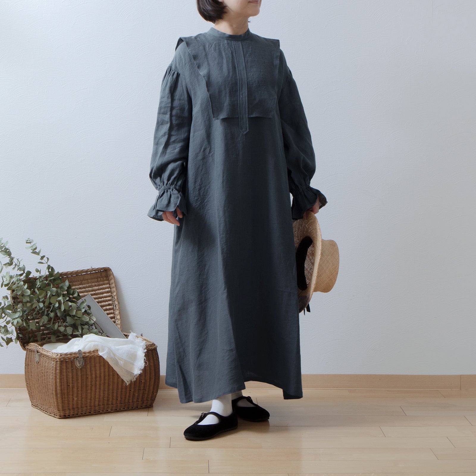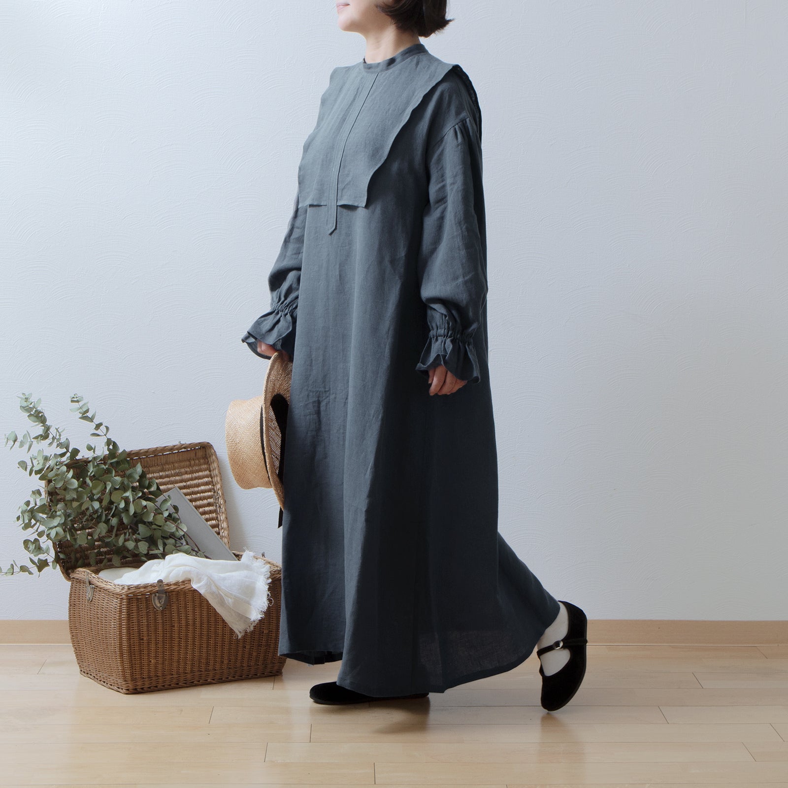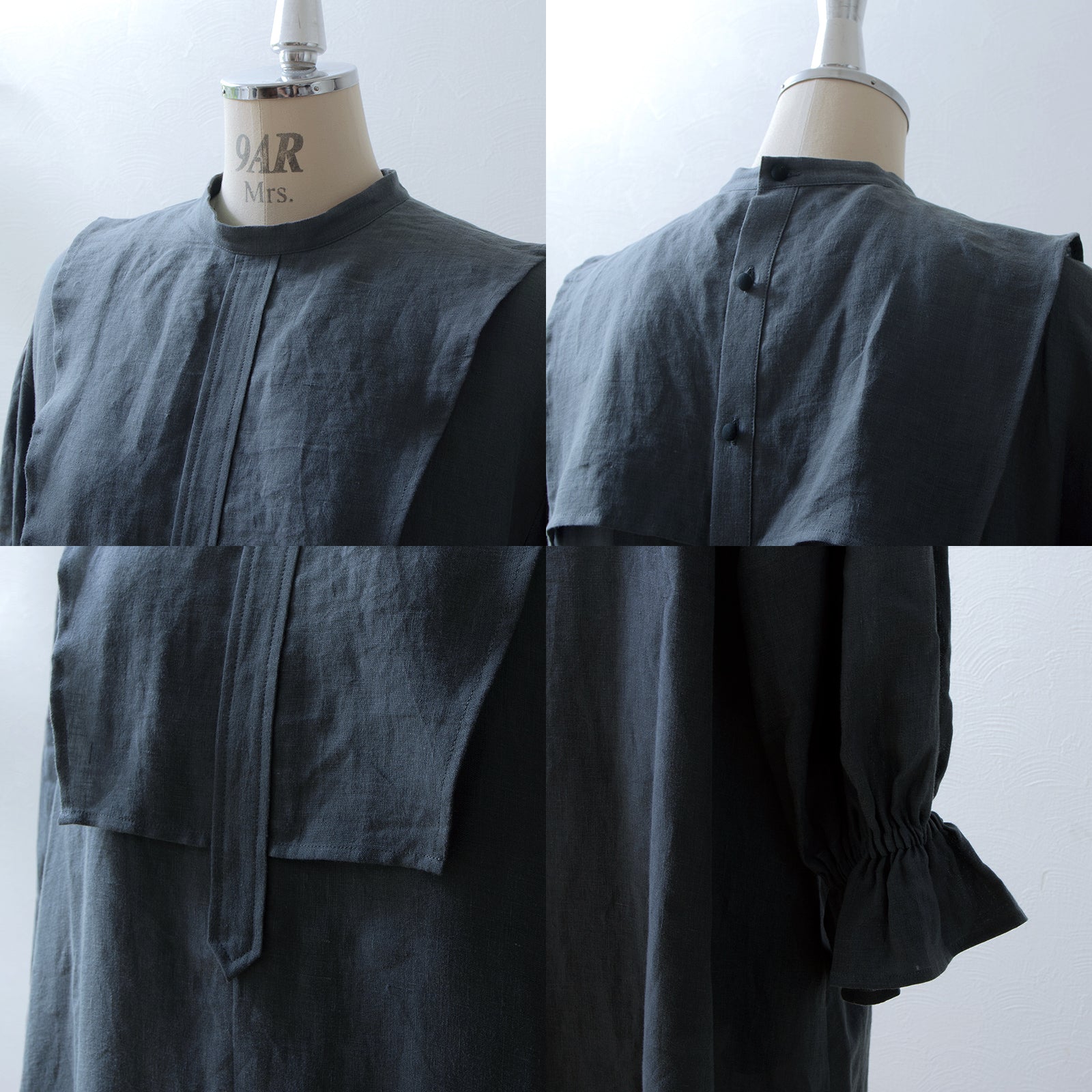 軛層褶袖亞麻洋裝/灰色