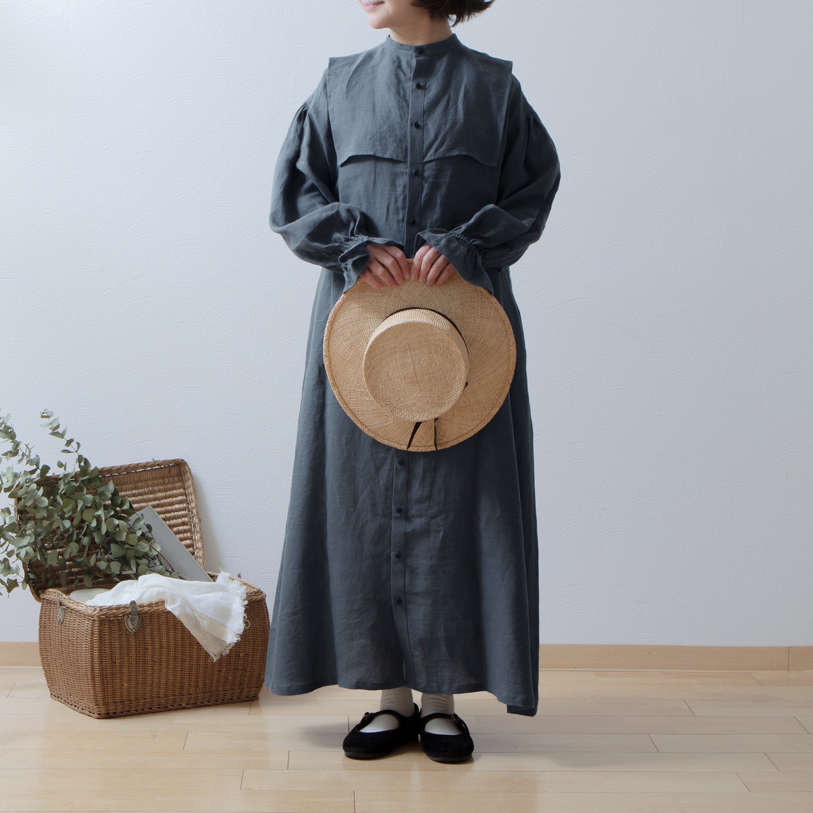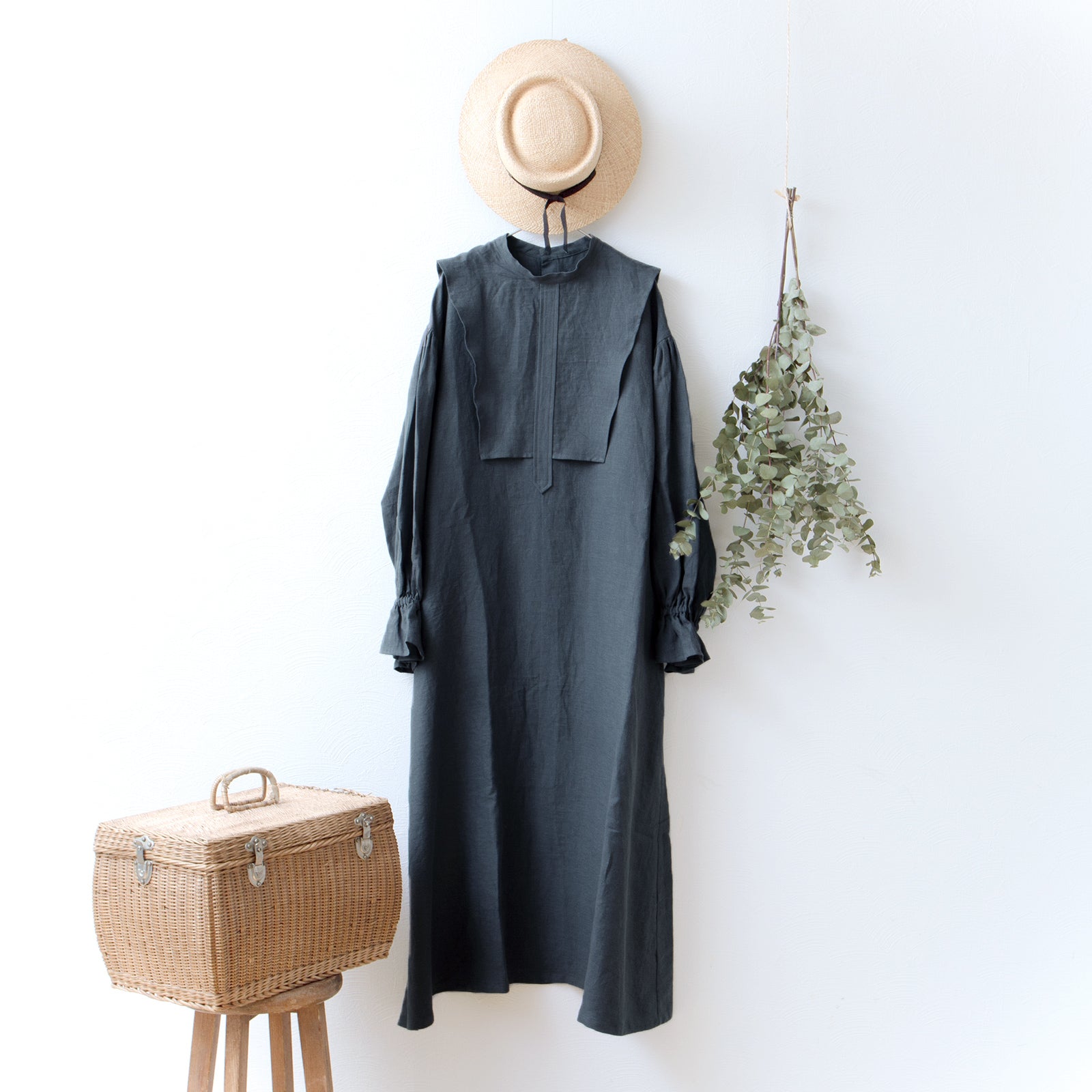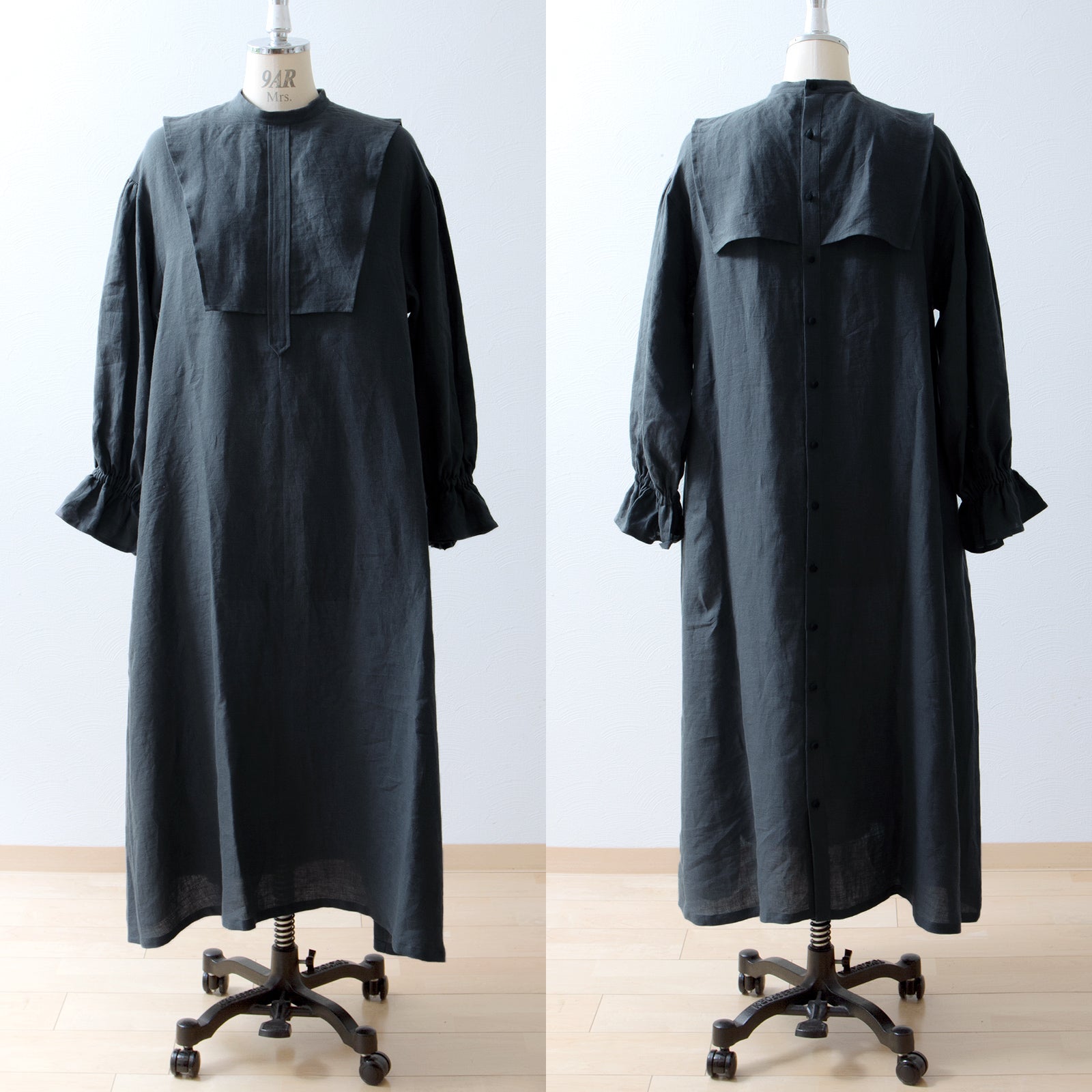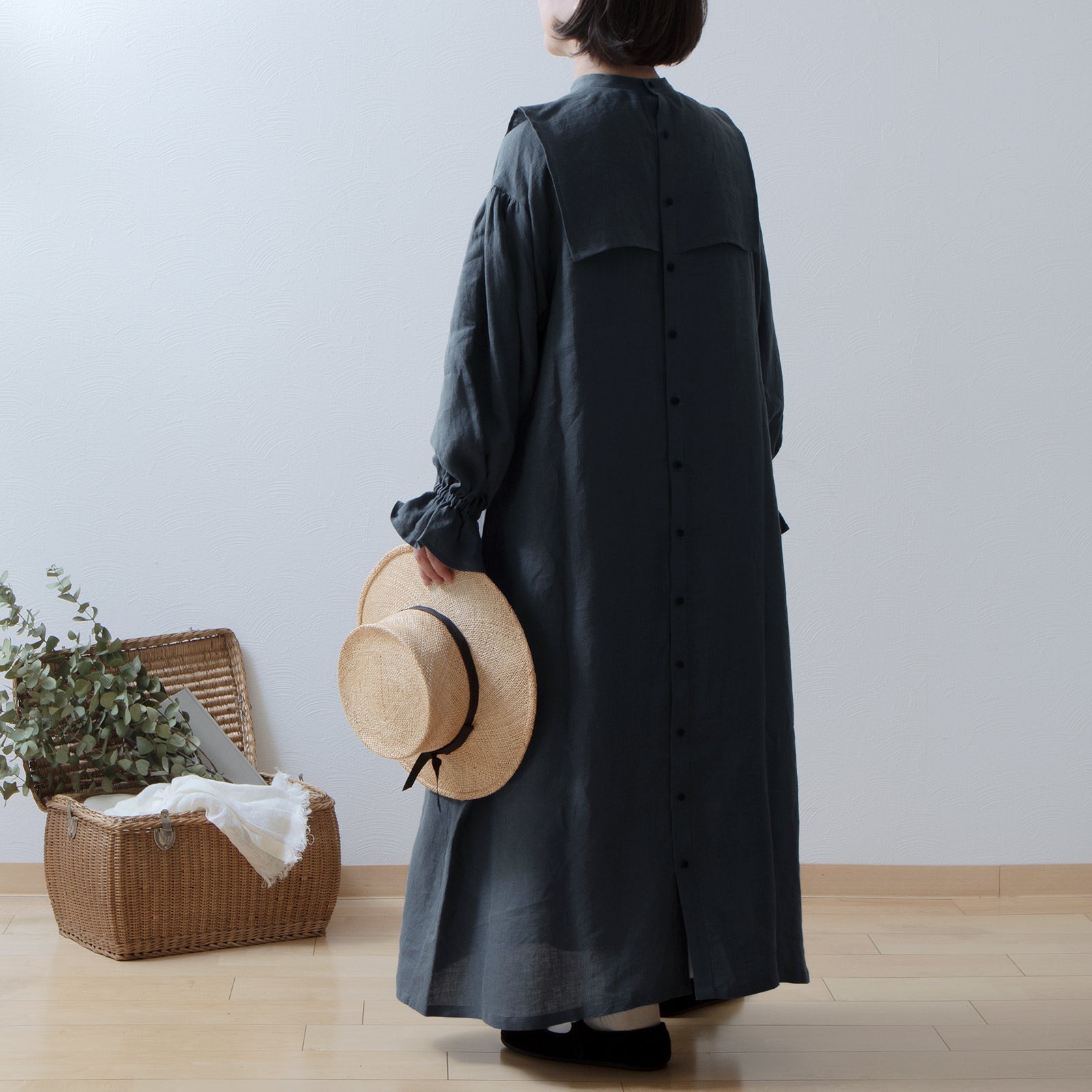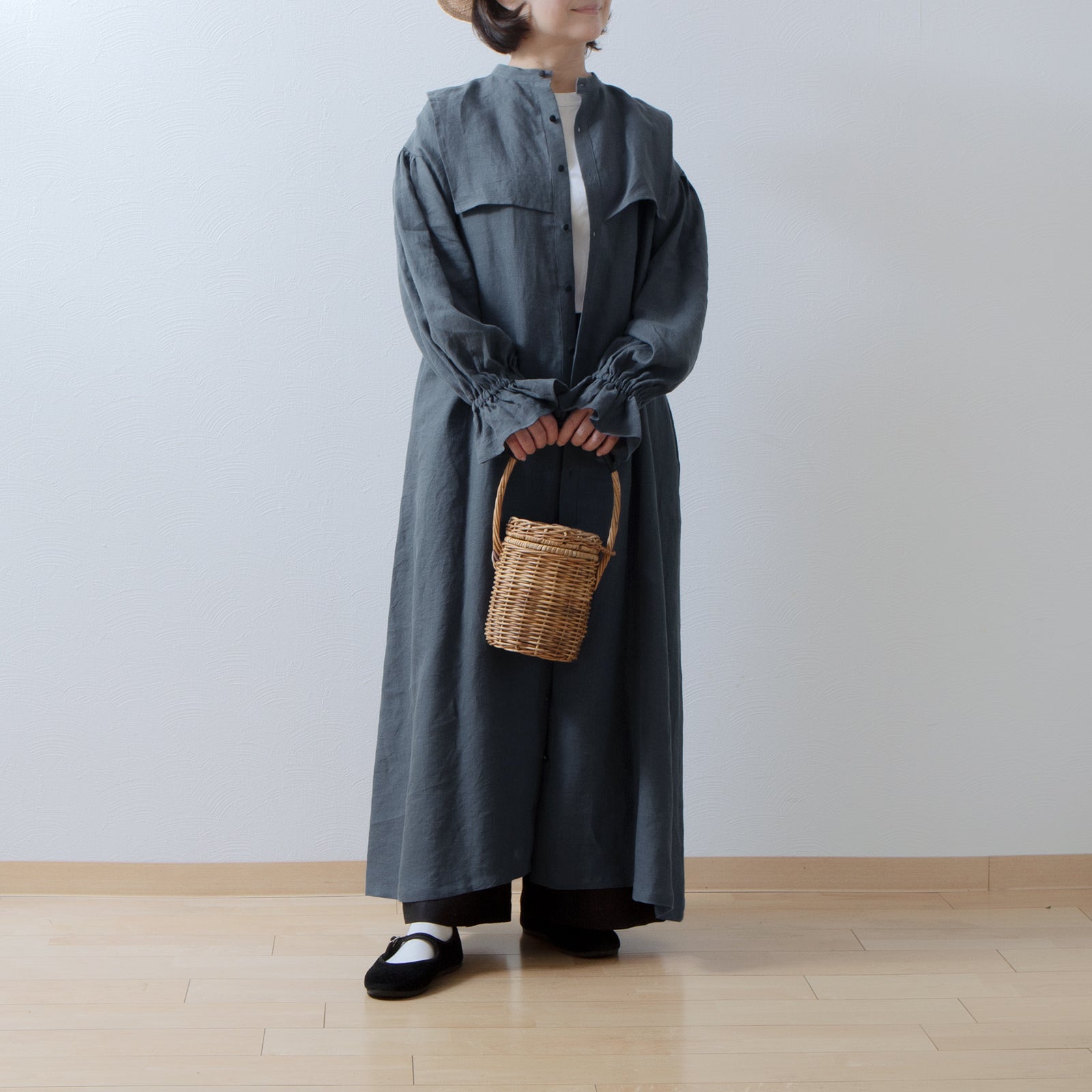 軛層褶袖亞麻洋裝/灰色