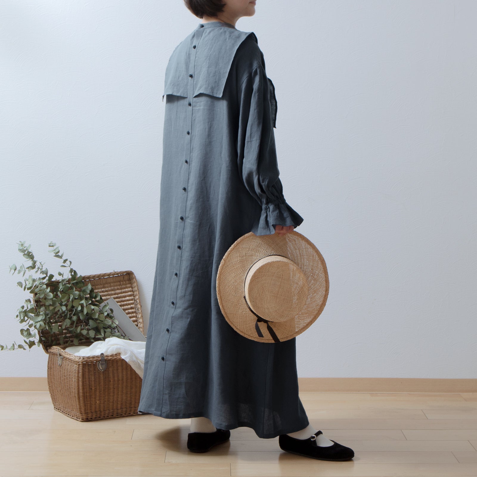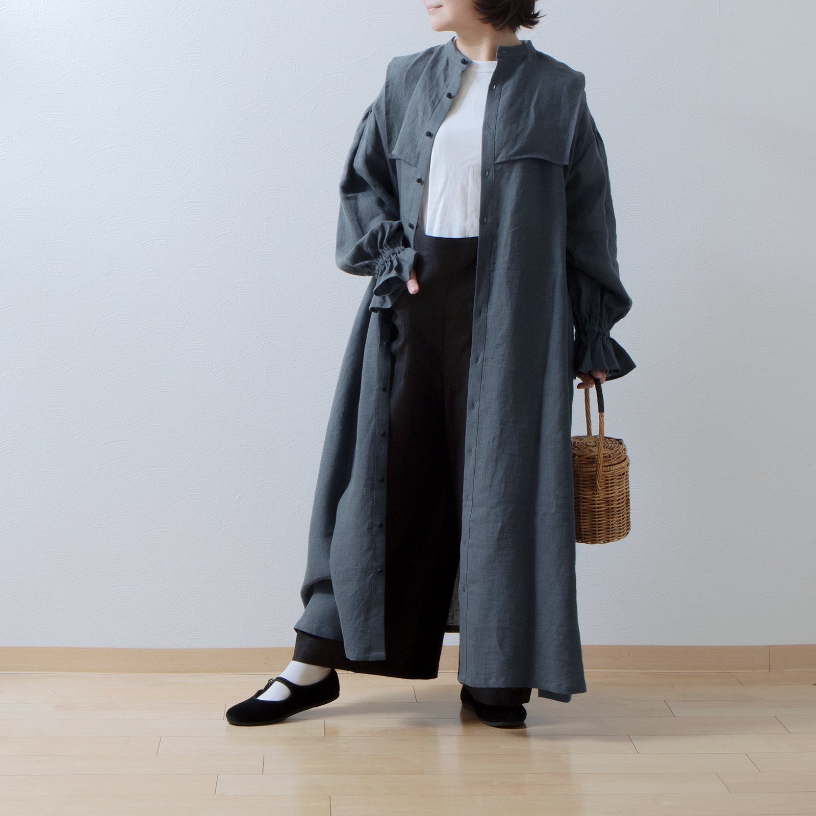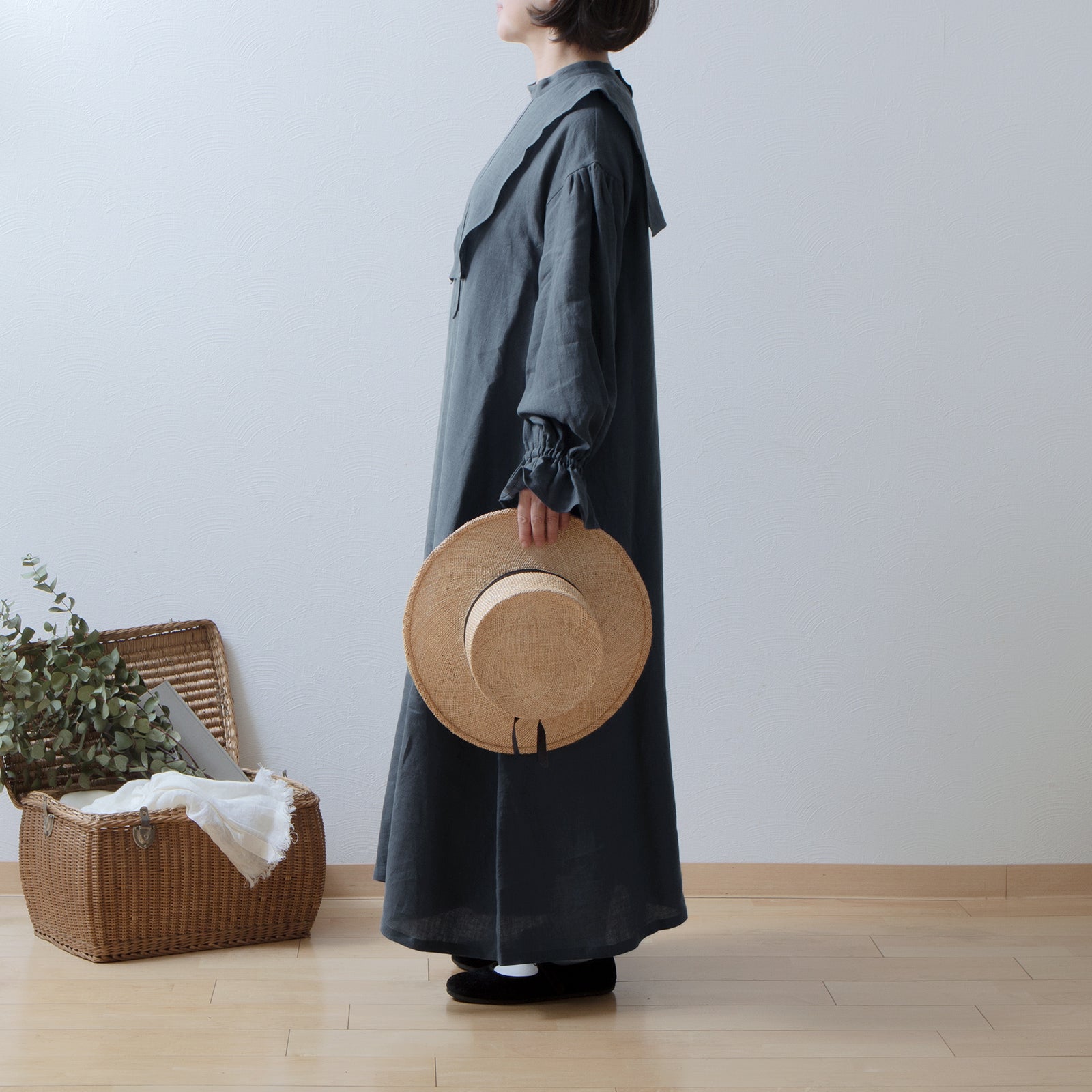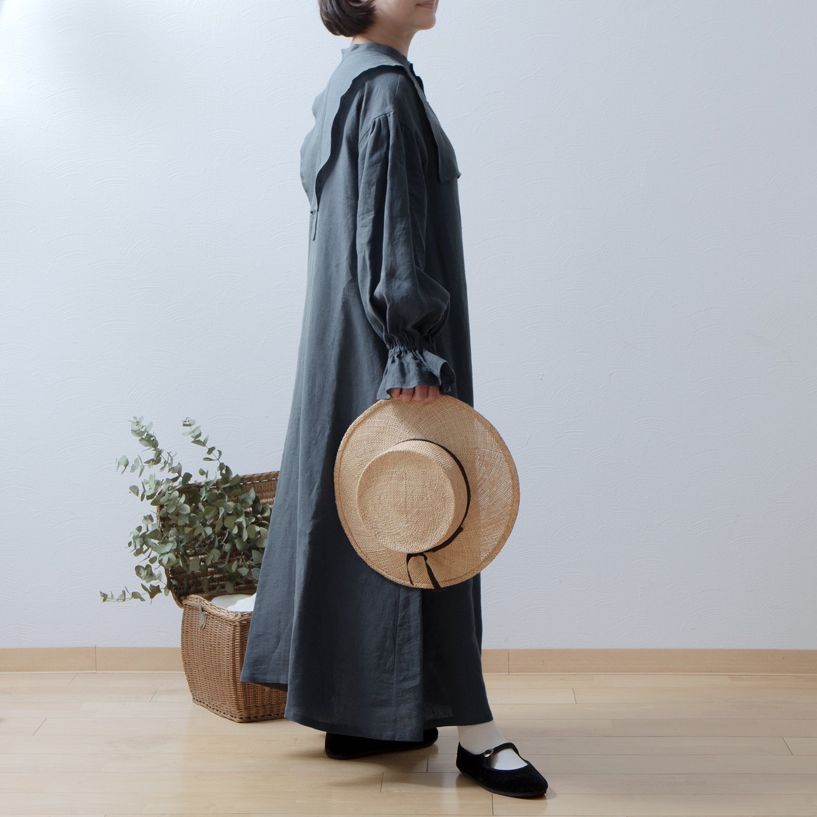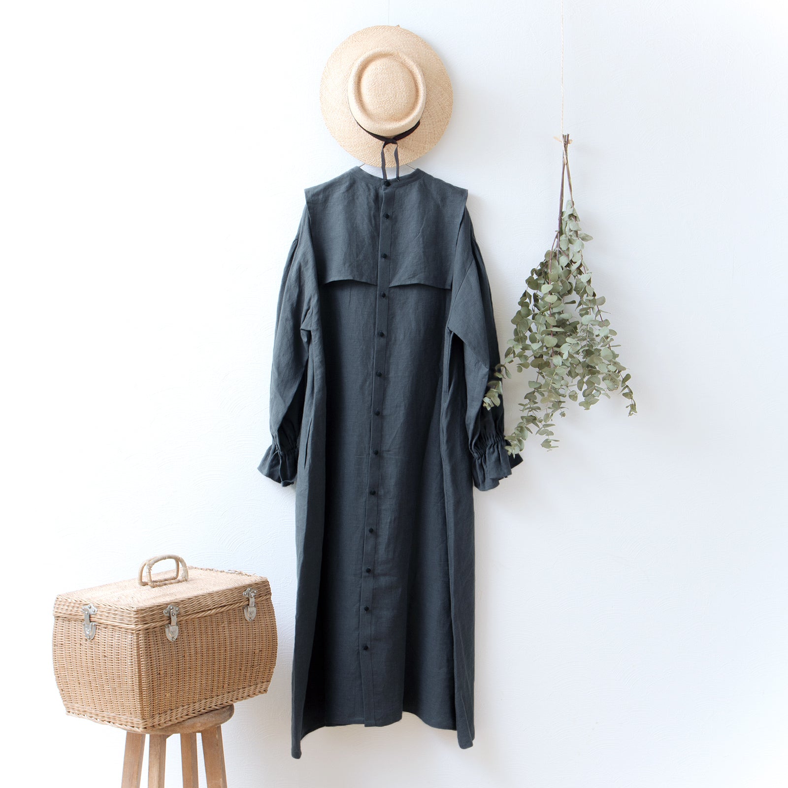 軛層褶袖亞麻洋裝/灰色