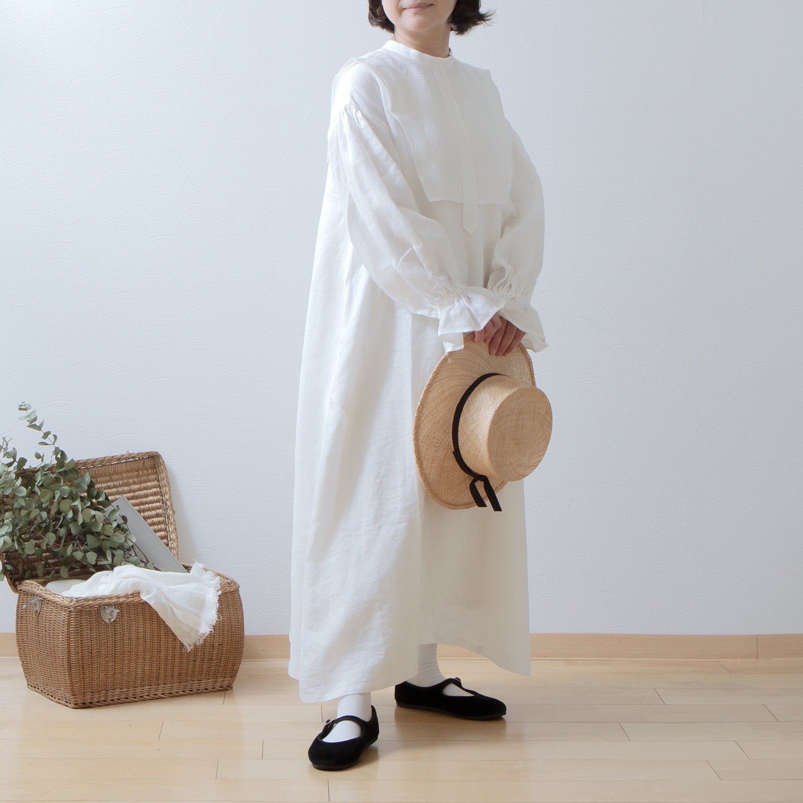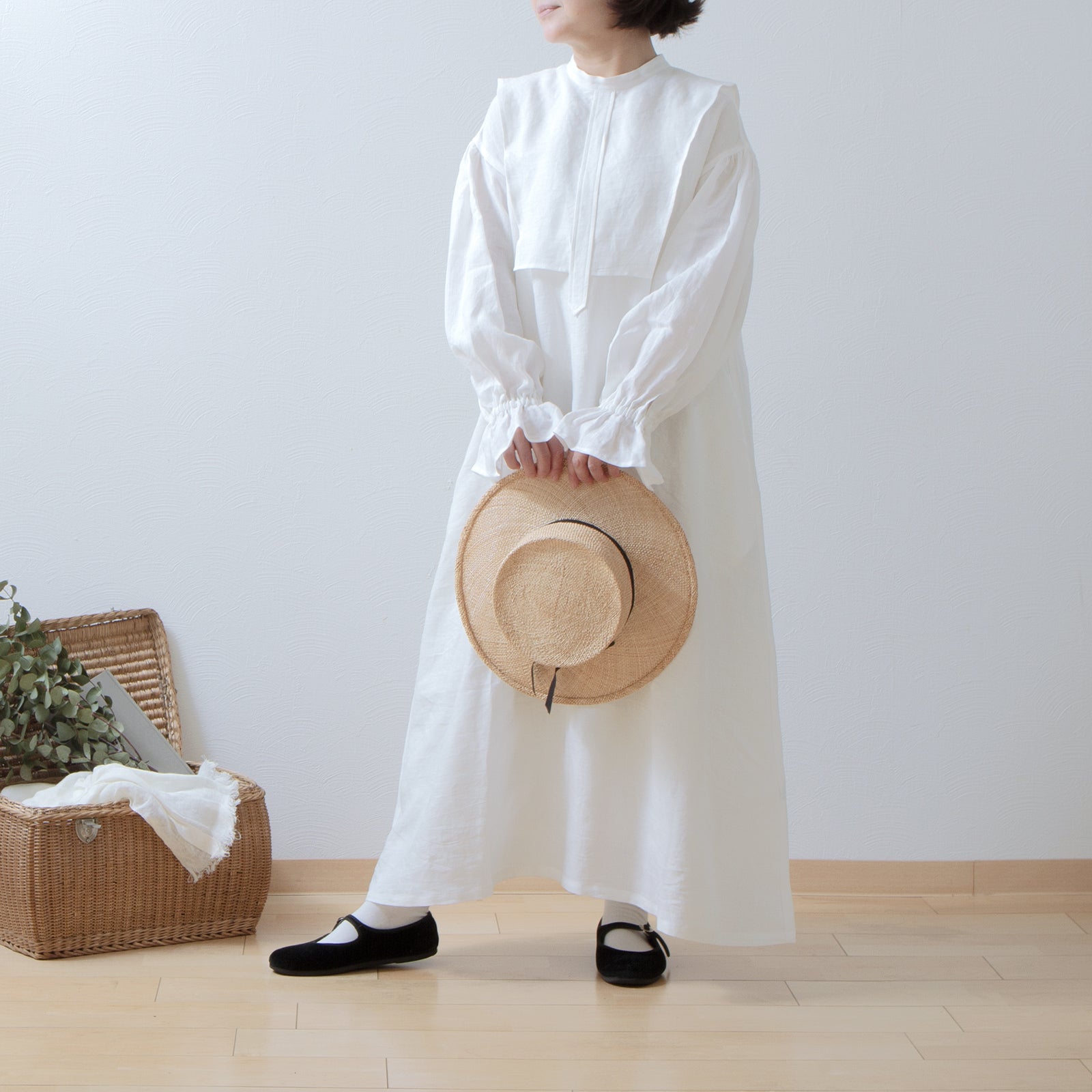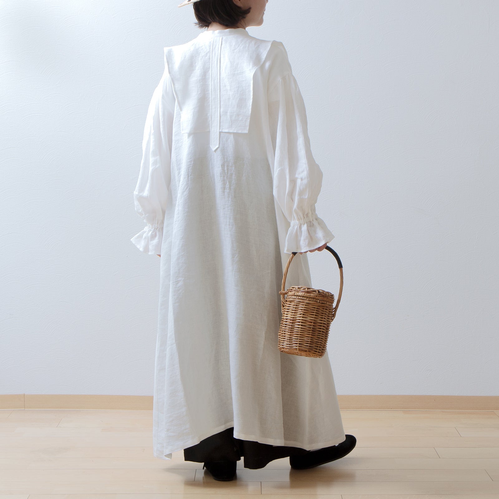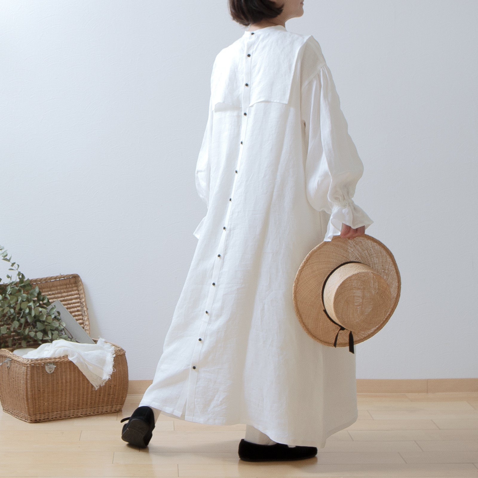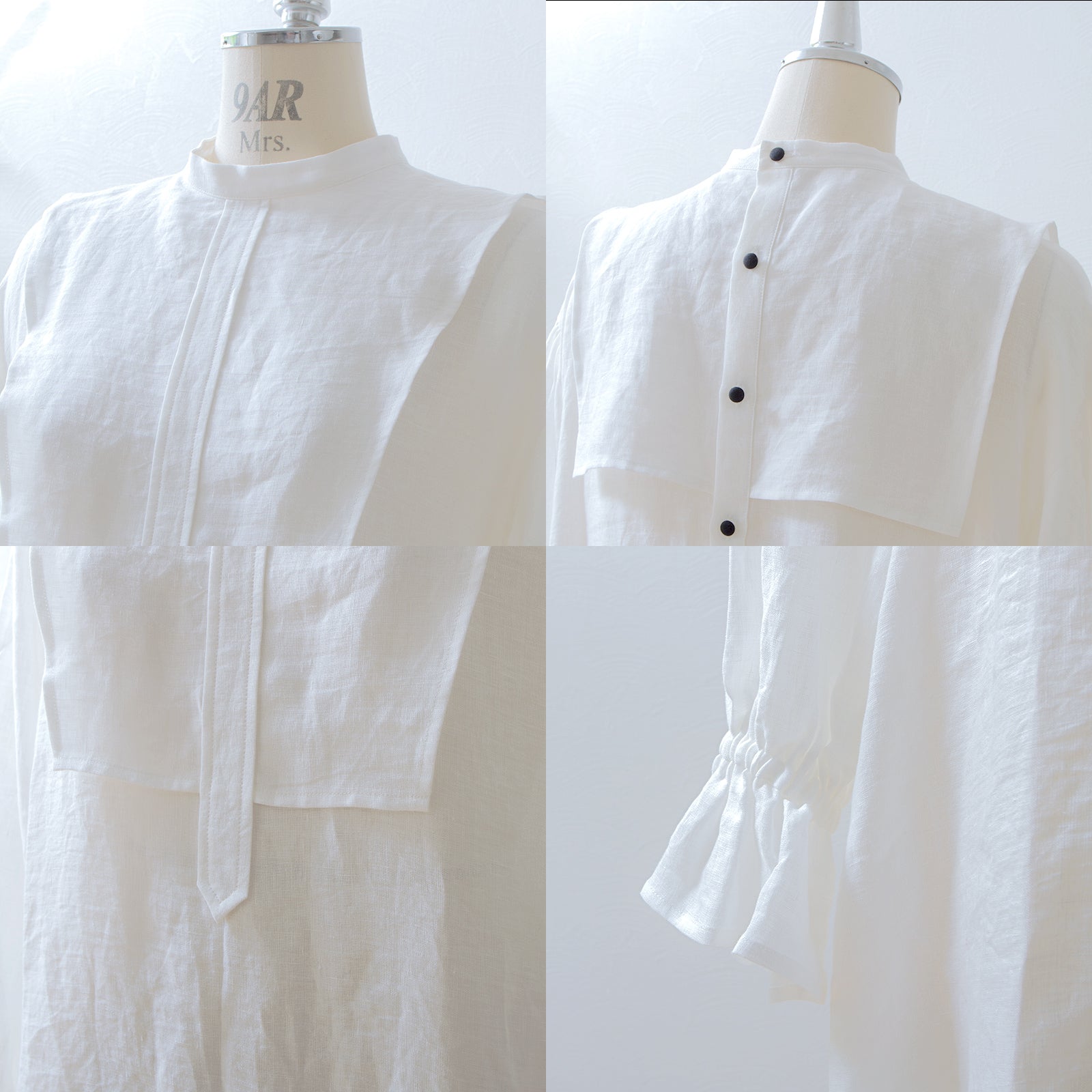 軛層褶袖亞麻洋裝/米白色