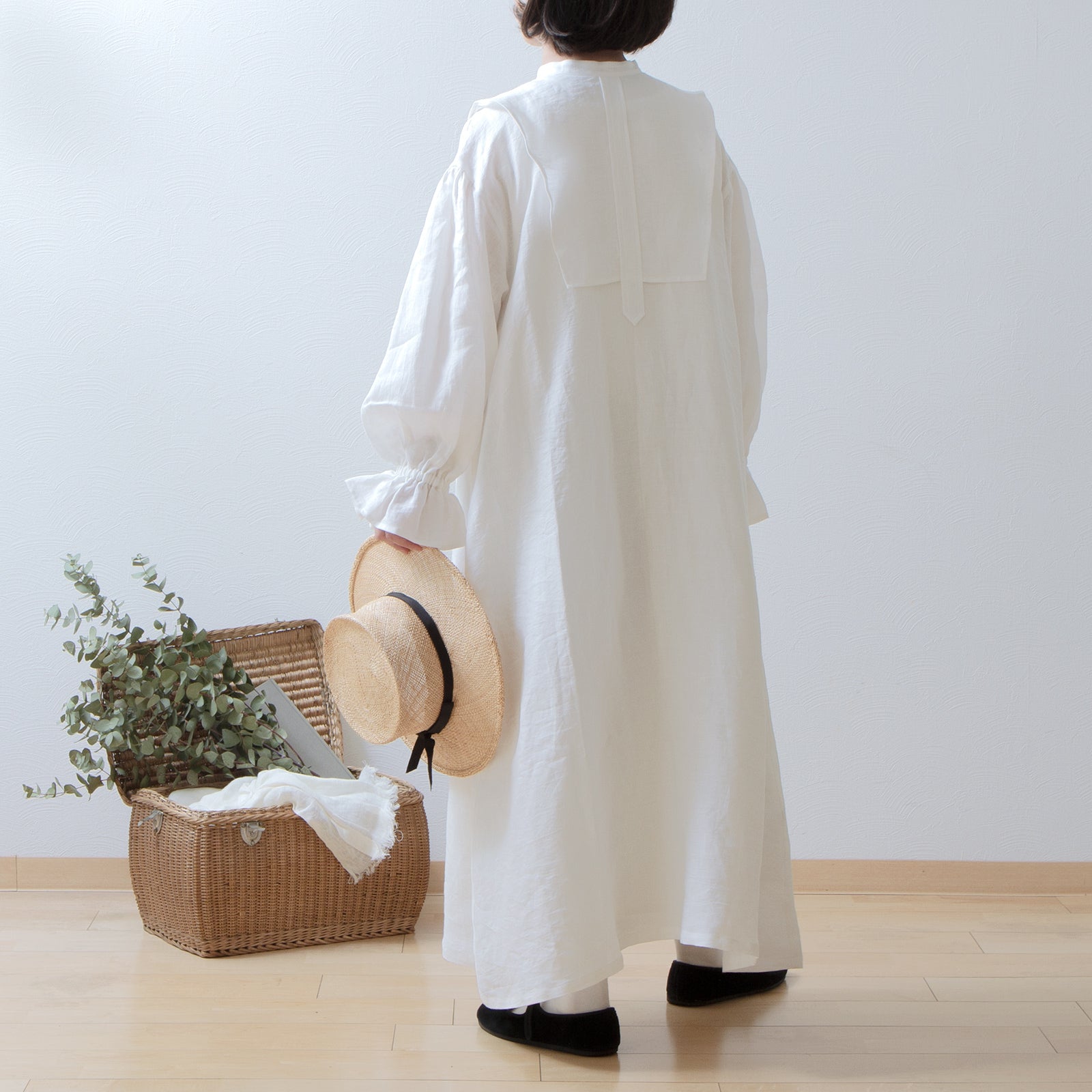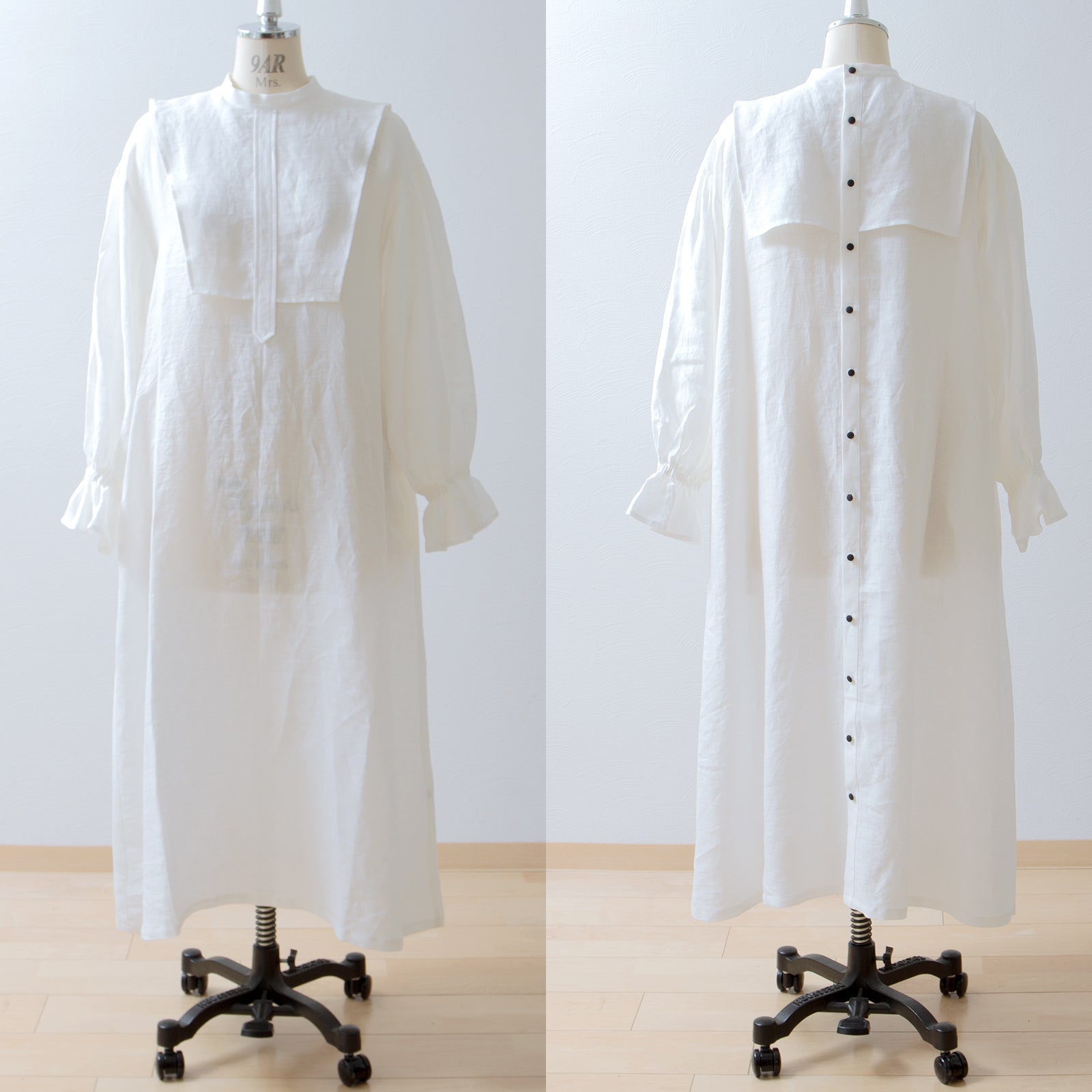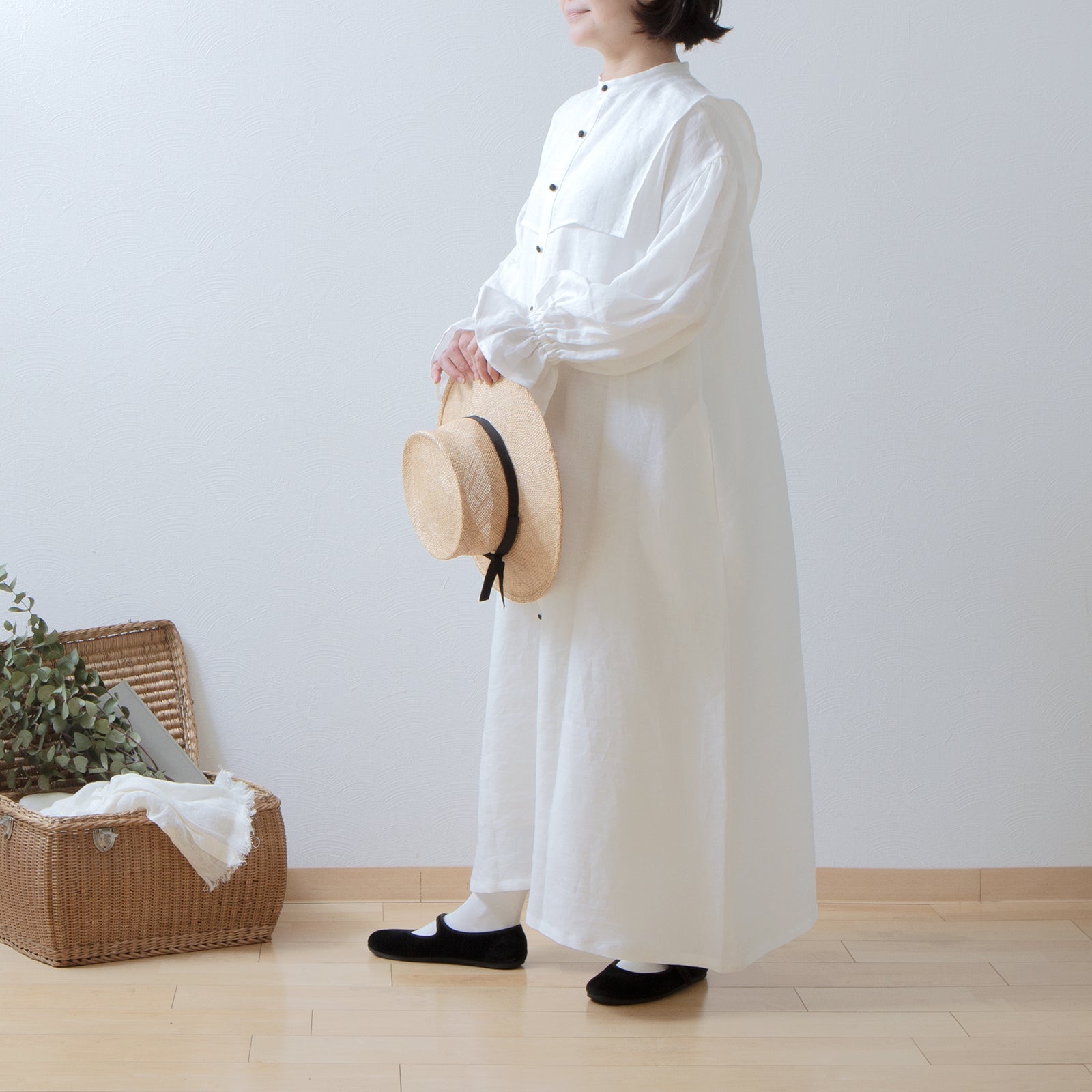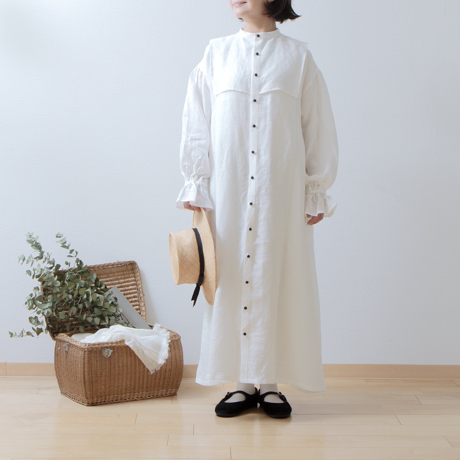軛層褶袖亞麻洋裝/米白色
