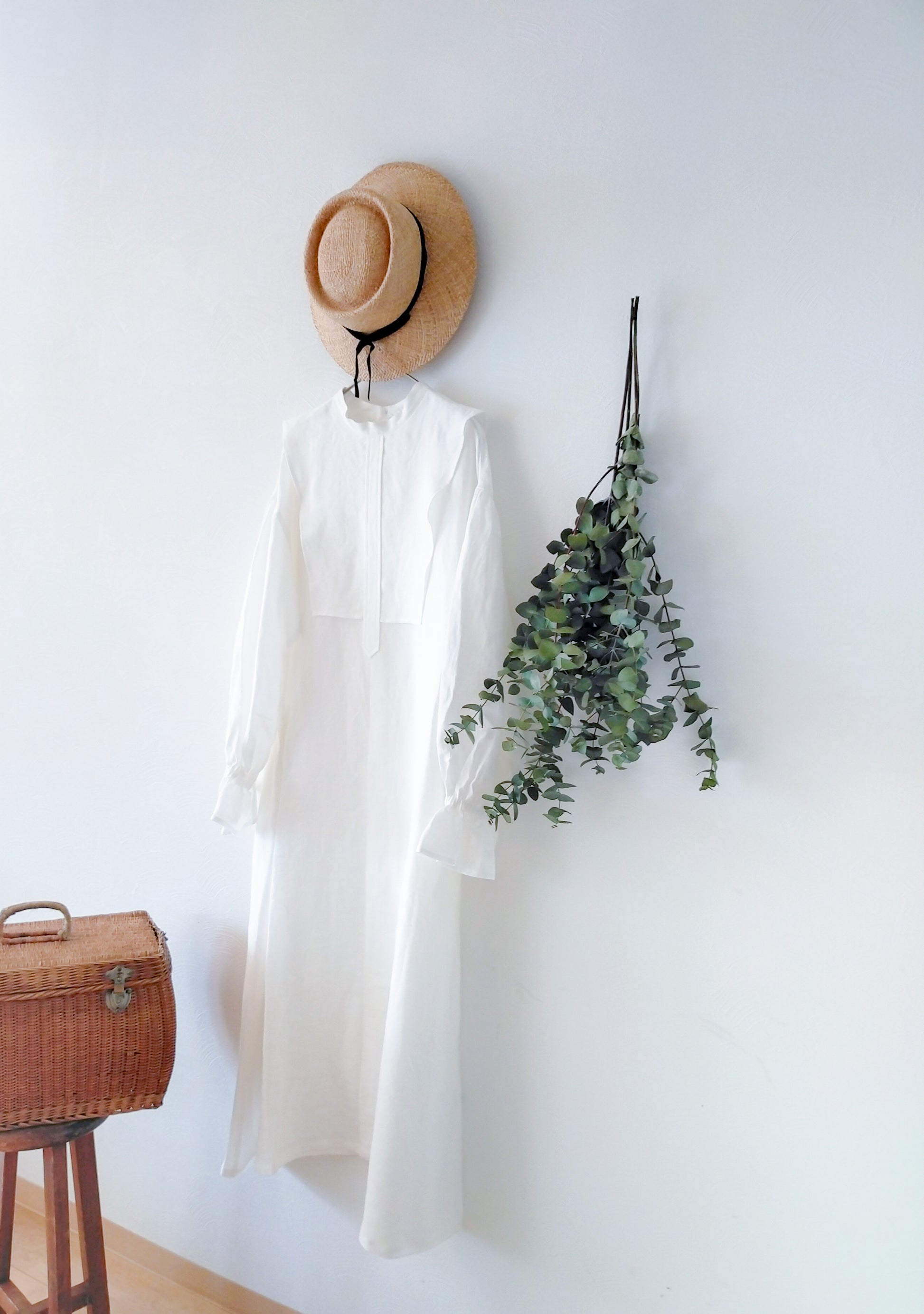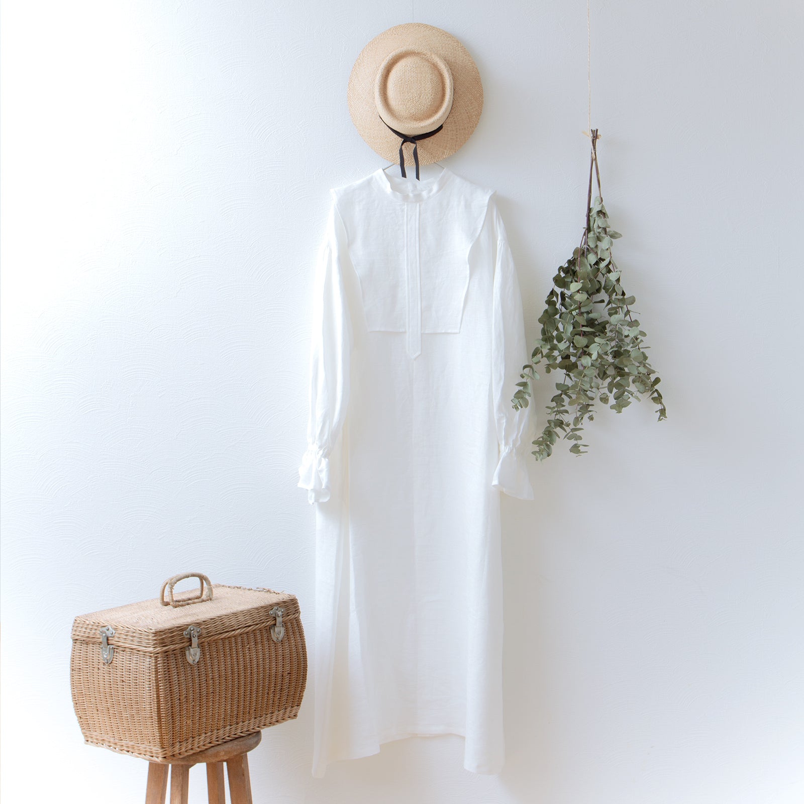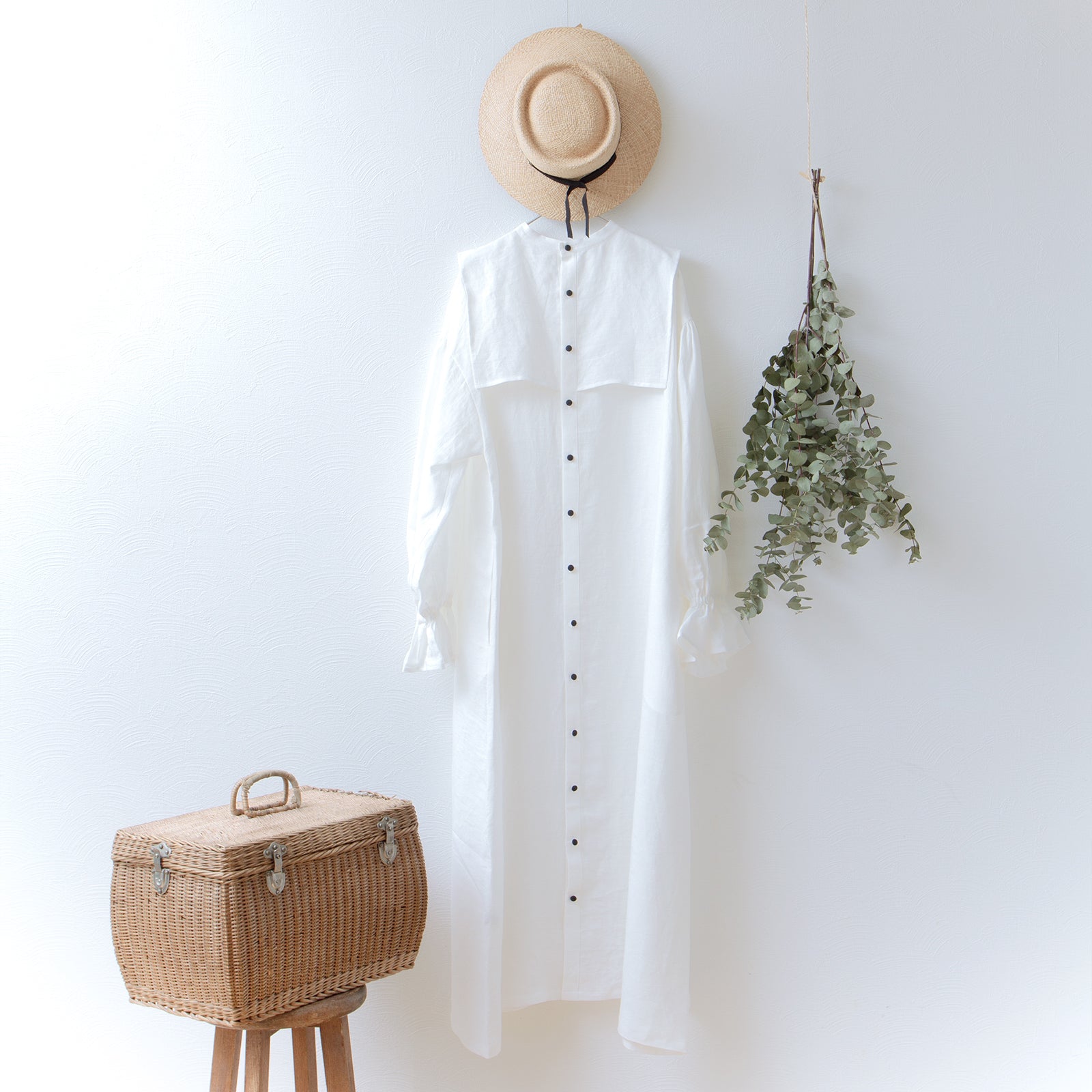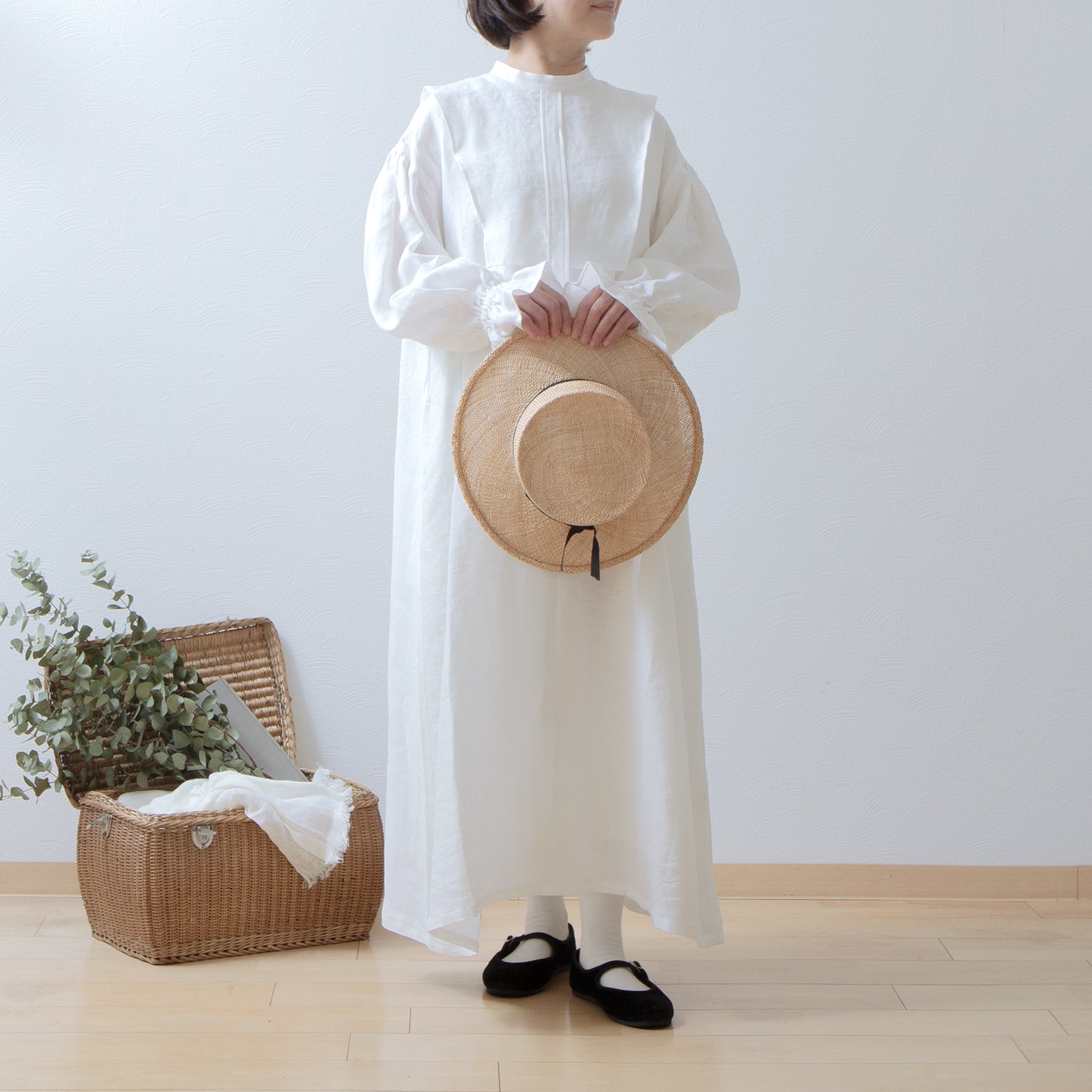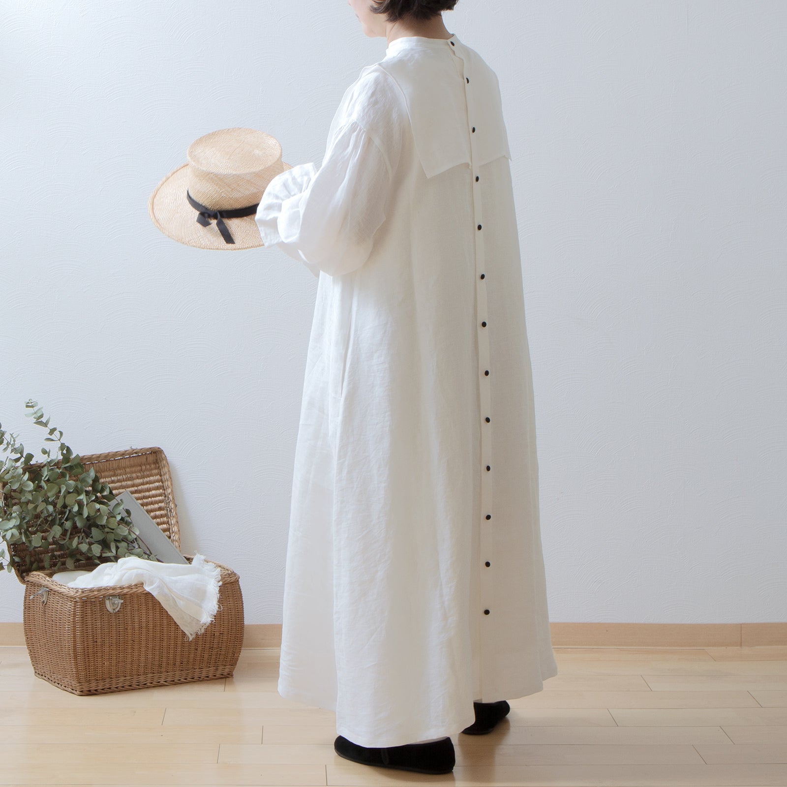 軛層褶袖亞麻洋裝/米白色