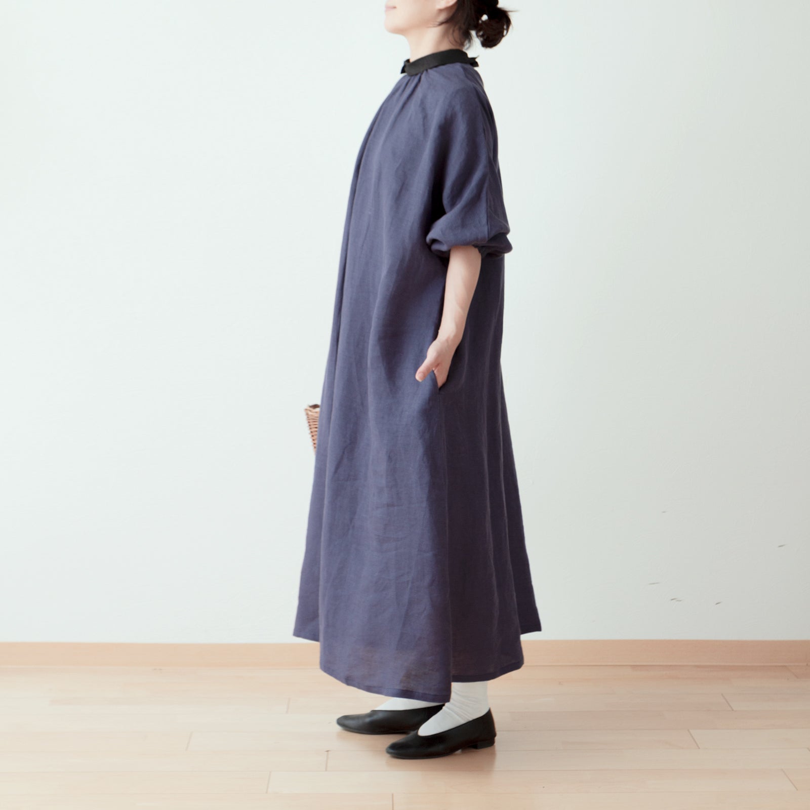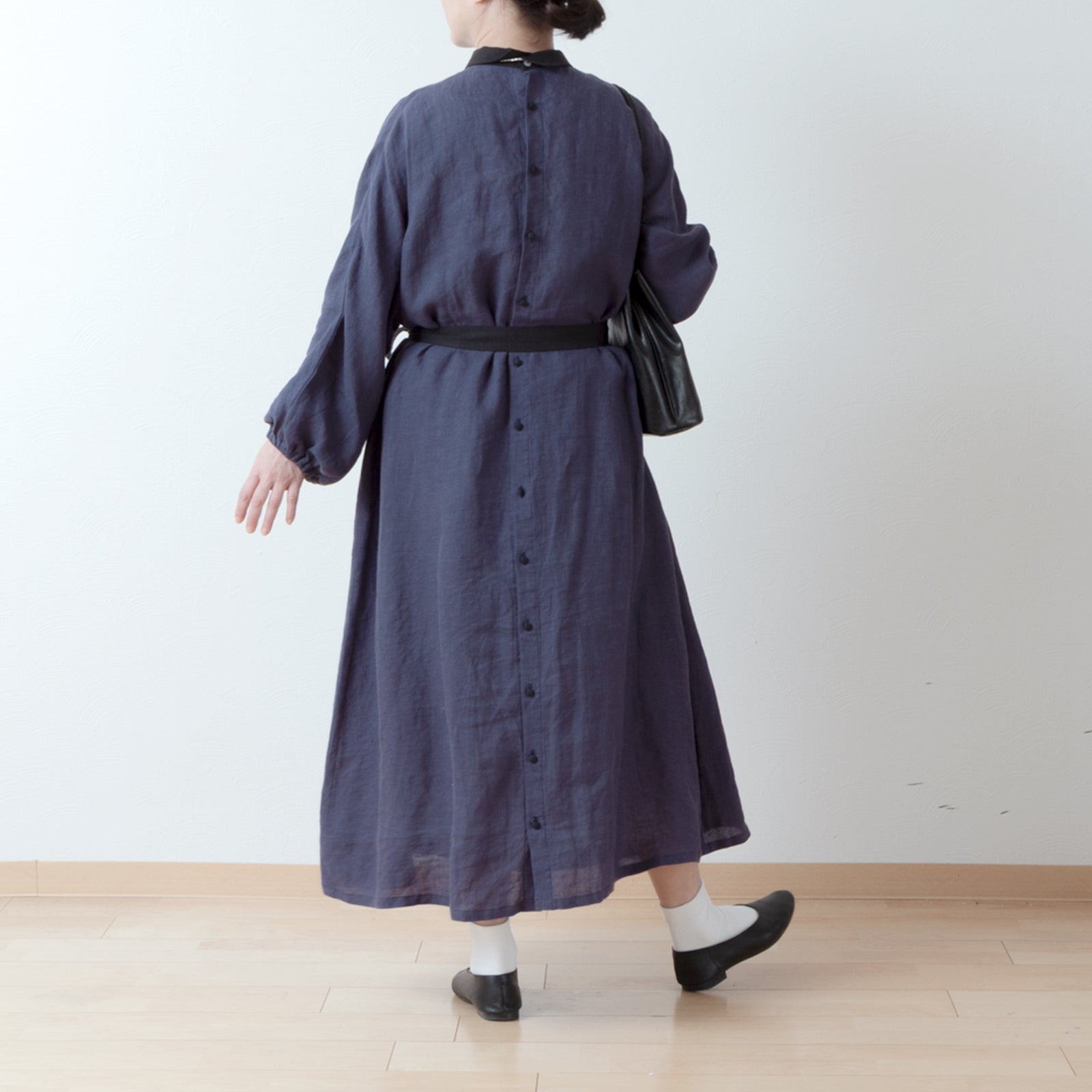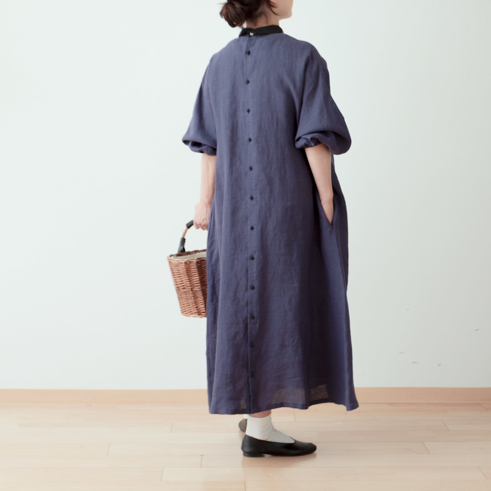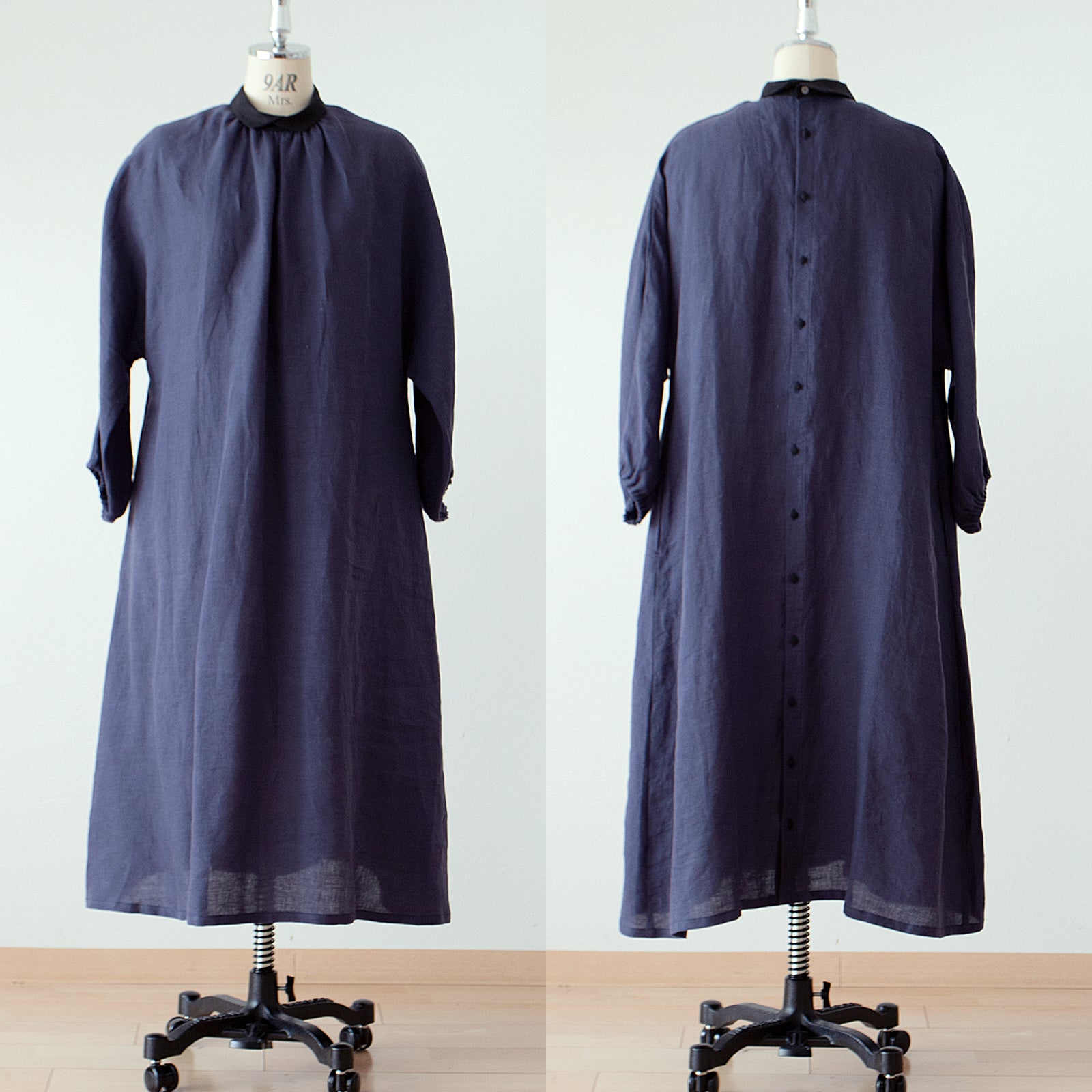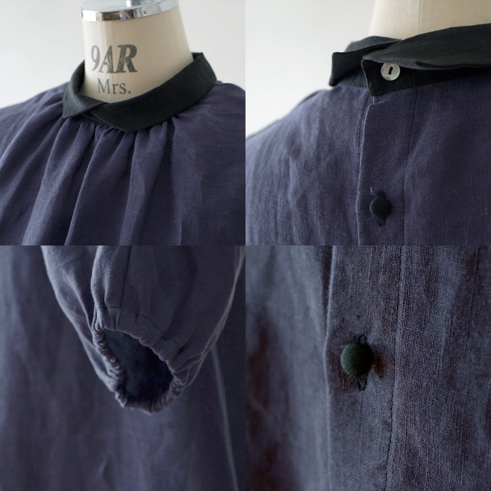 優雅可愛的牧師領,背面有紐扣,袖子寬大,採用法國亞麻 A 字裙/紫色海軍藍牧師