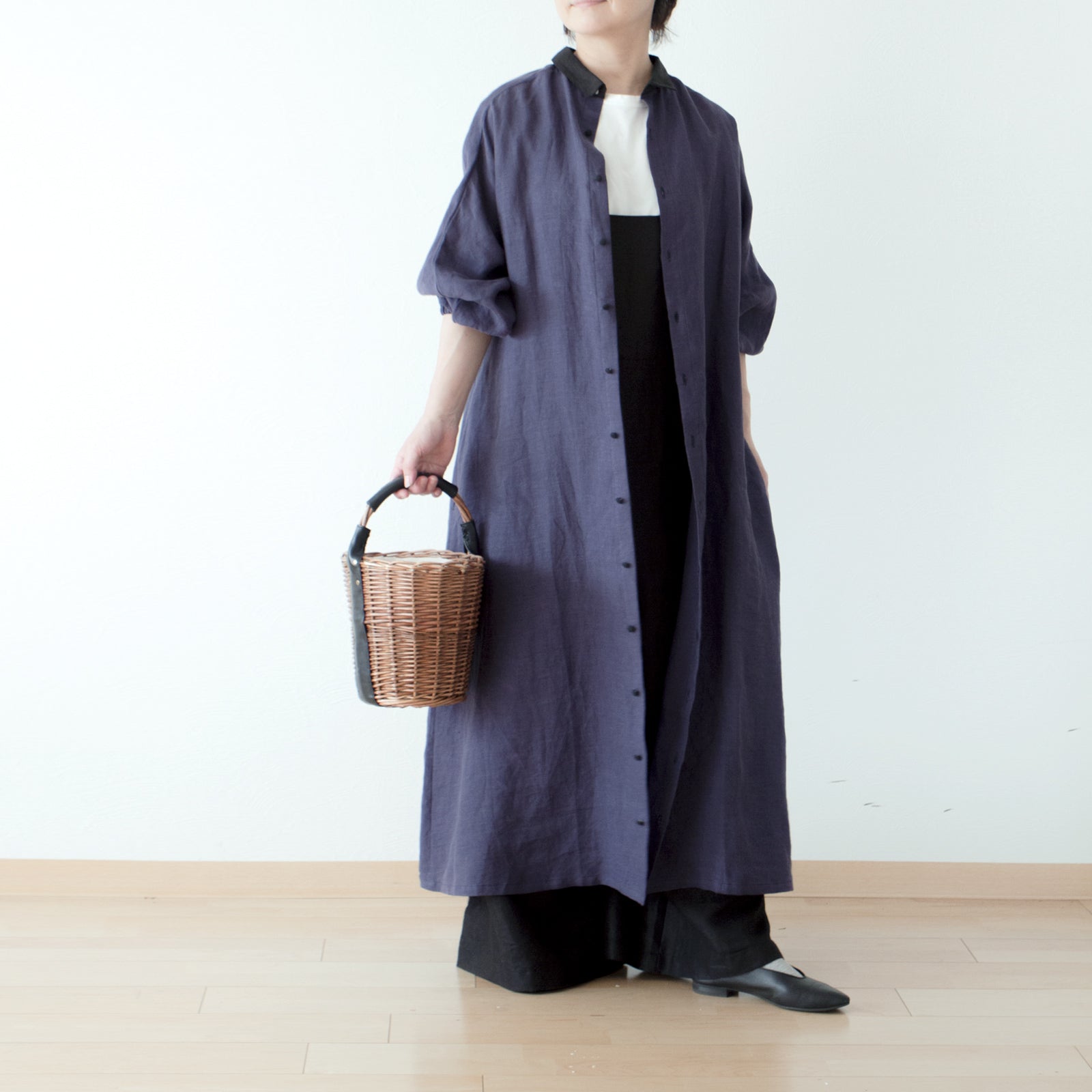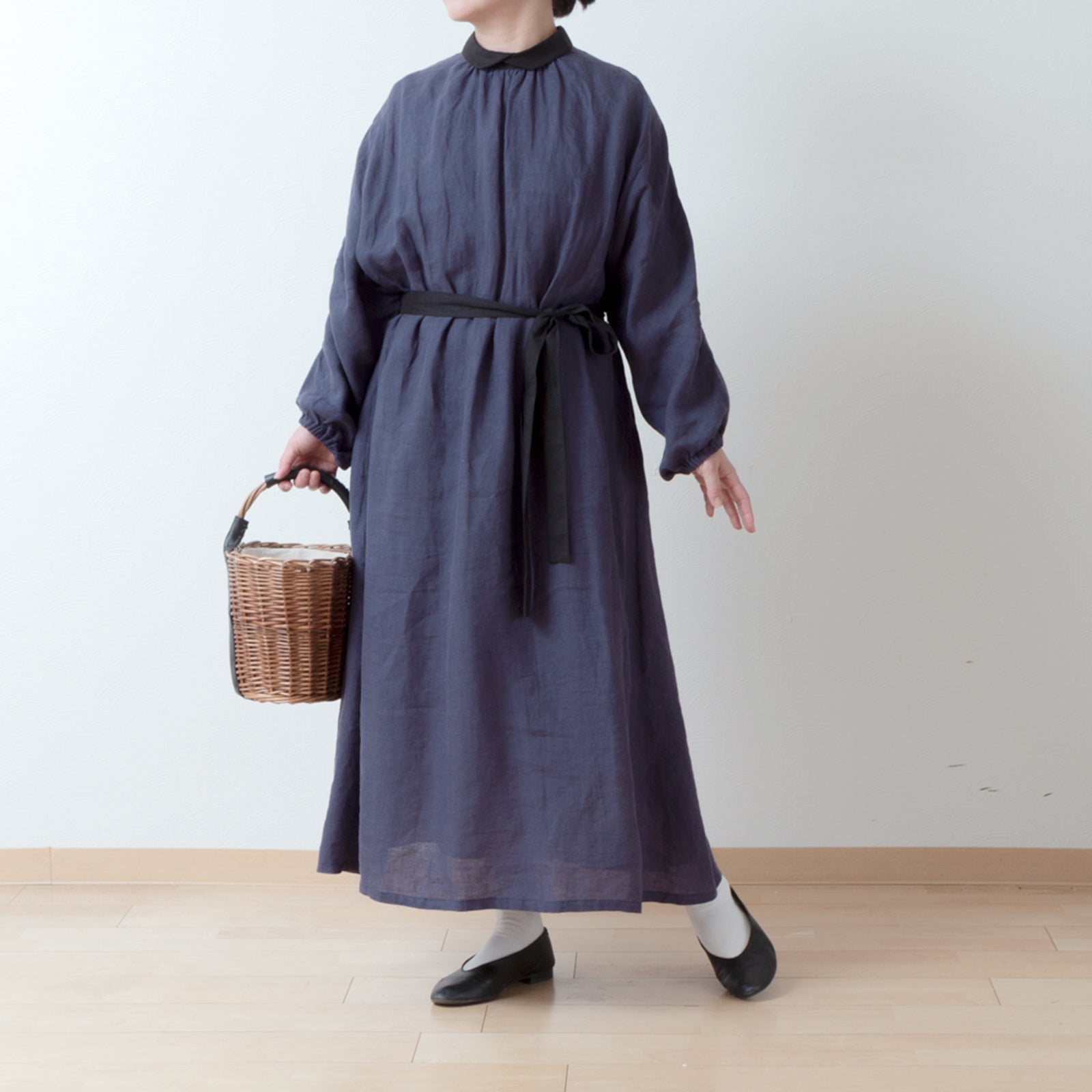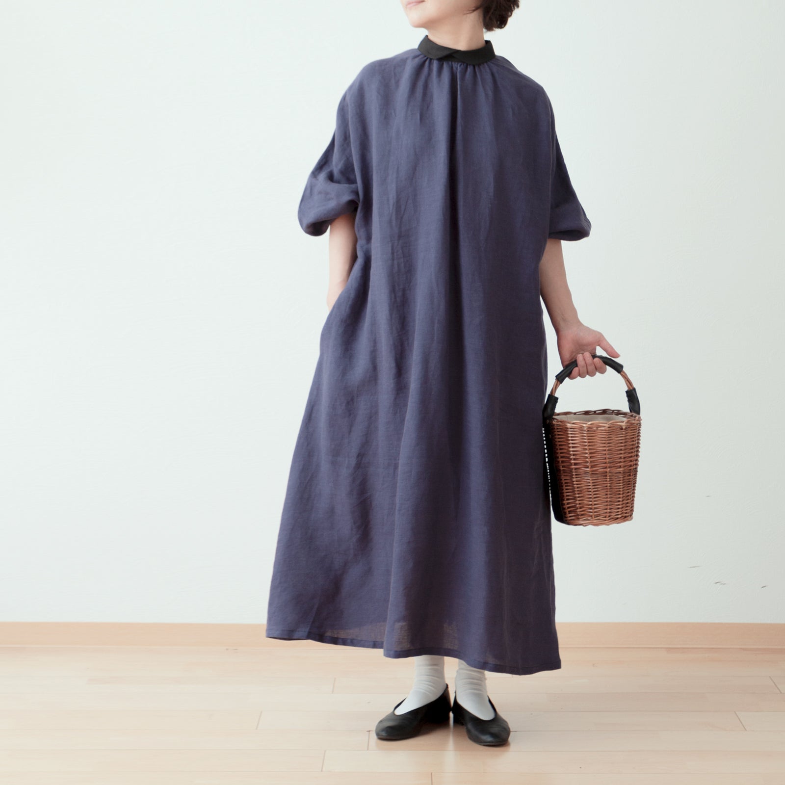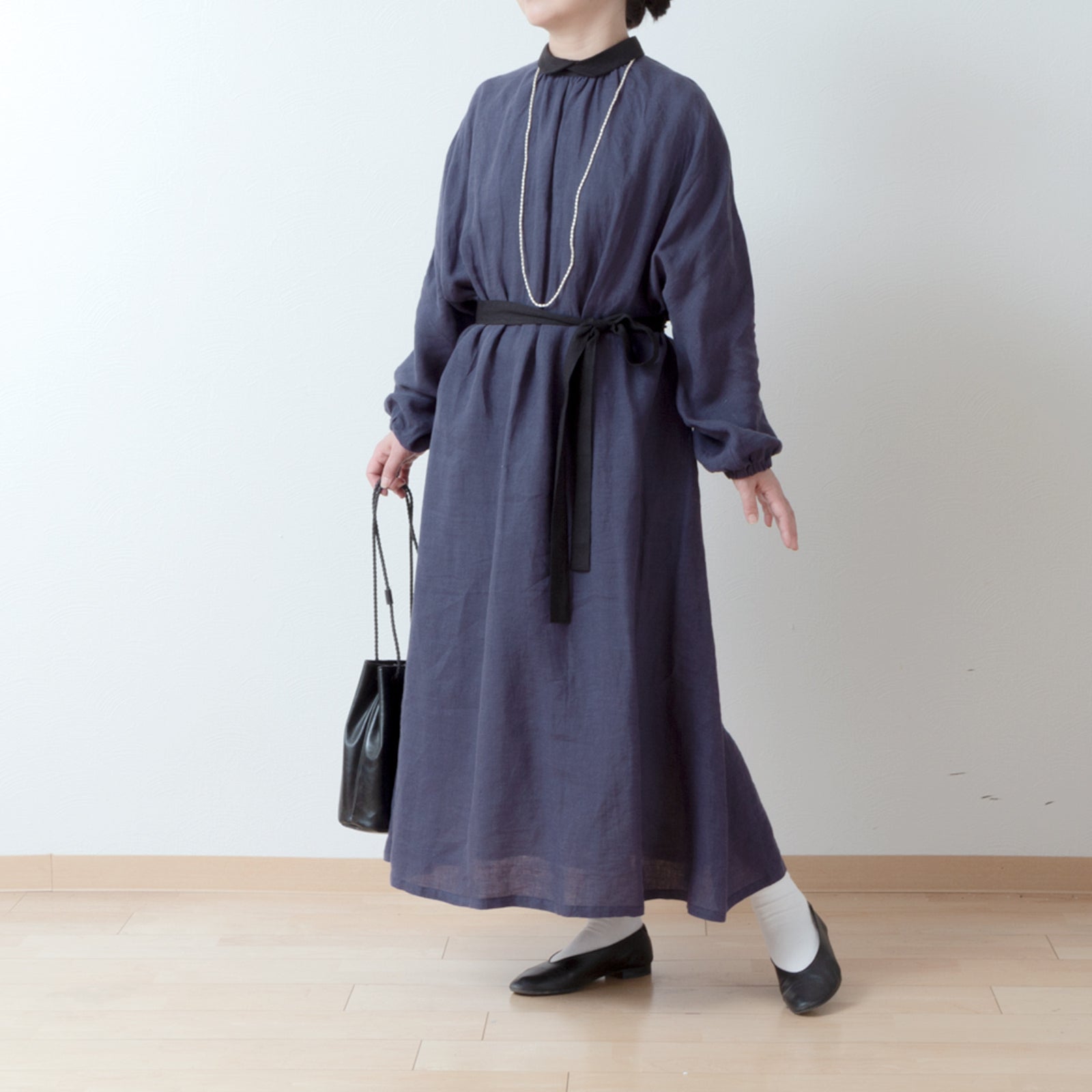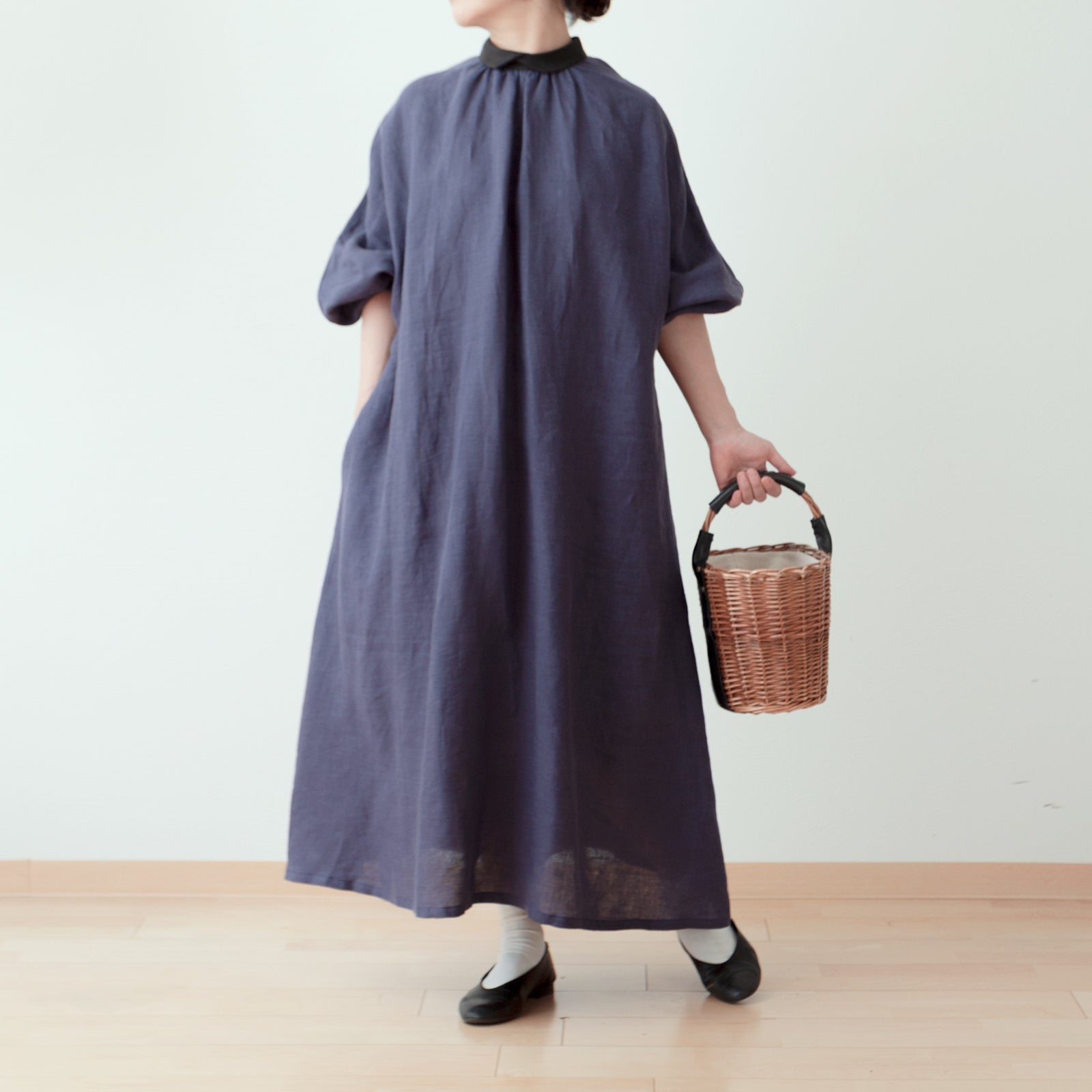 優雅可愛的牧師領,背面有紐扣,袖子寬大,採用法國亞麻 A 字裙/紫色海軍藍牧師
