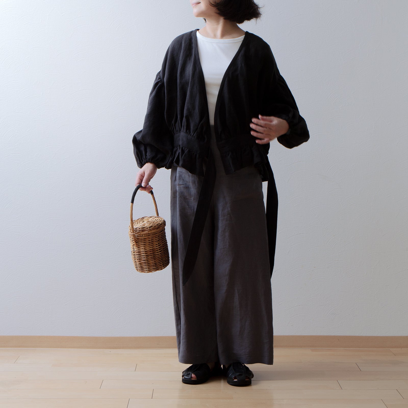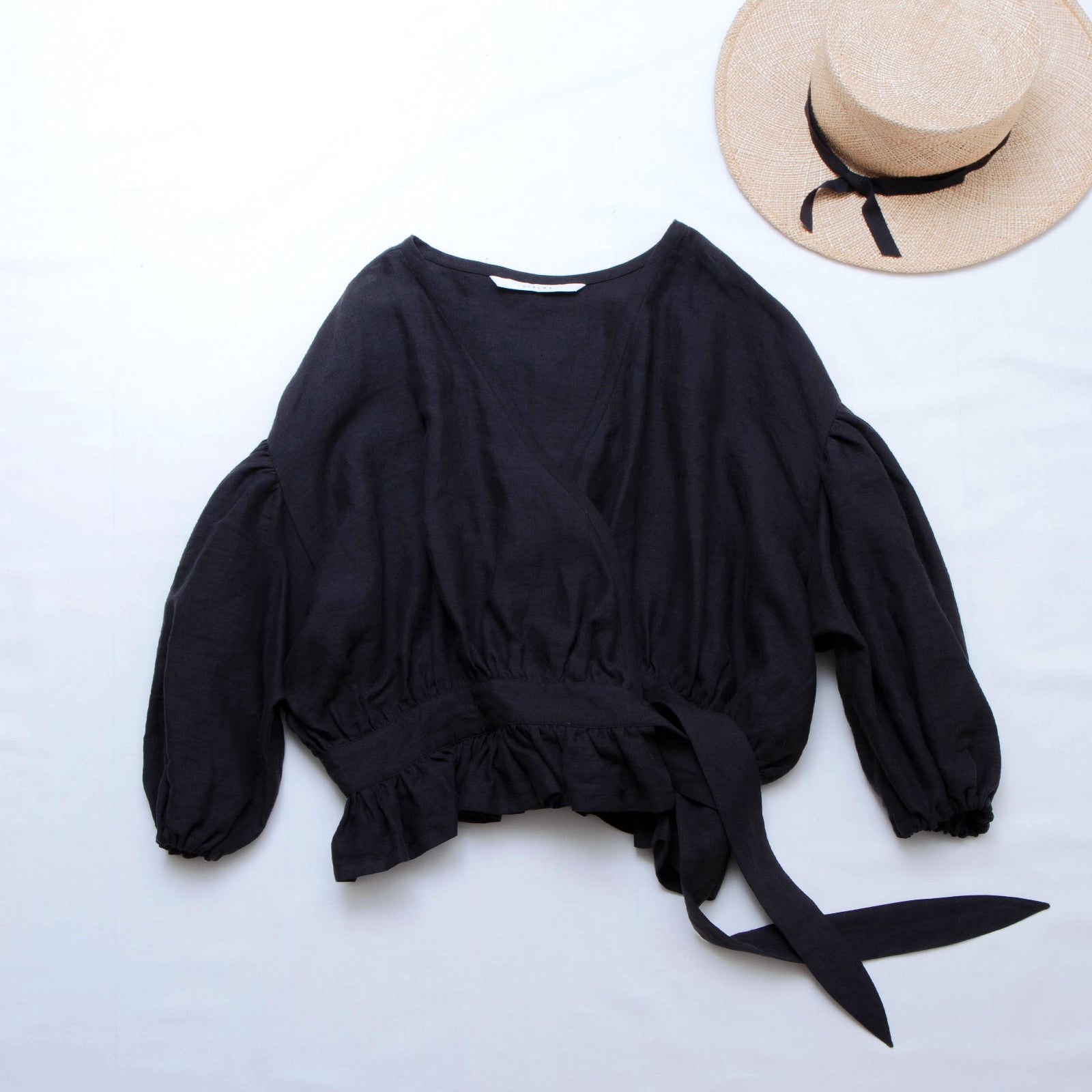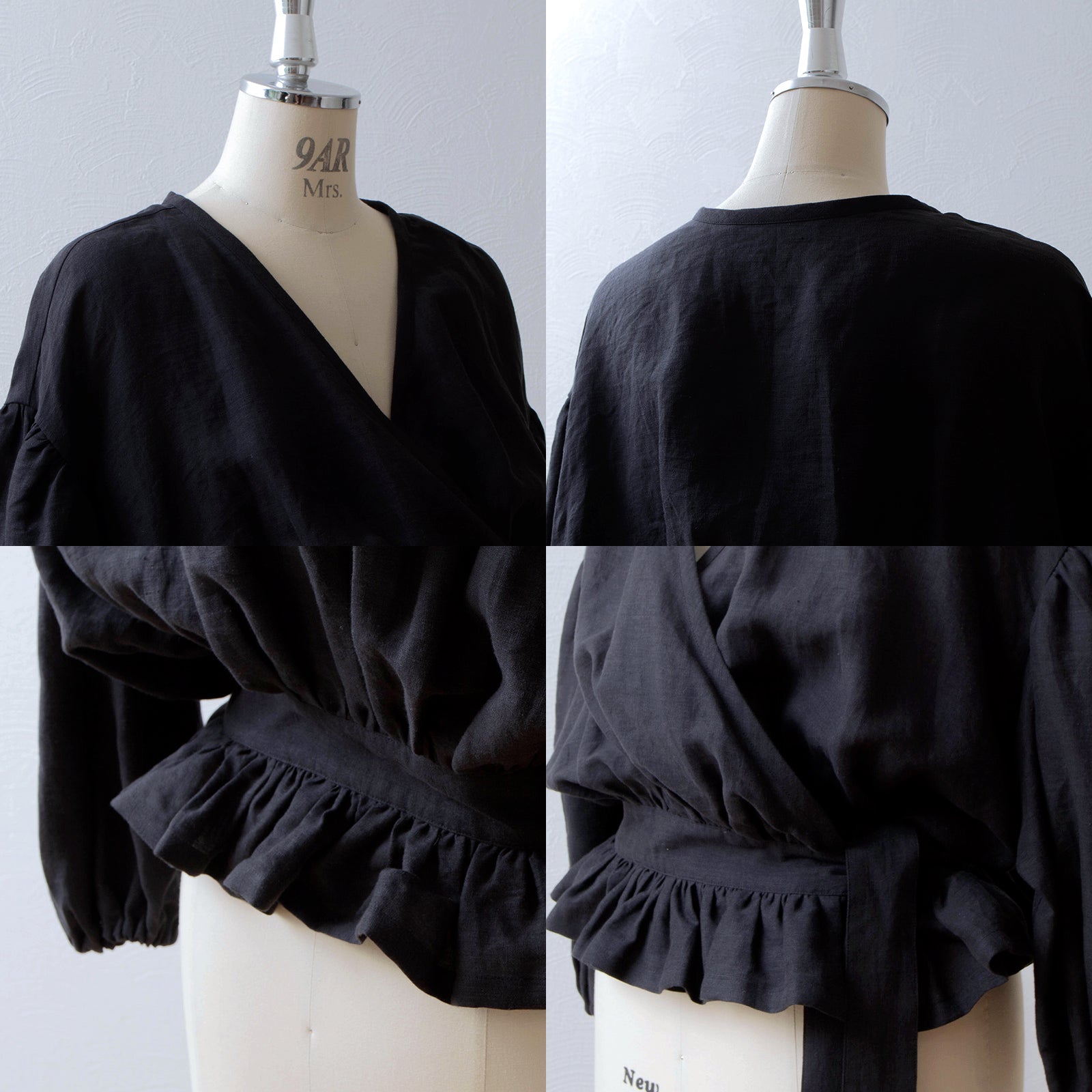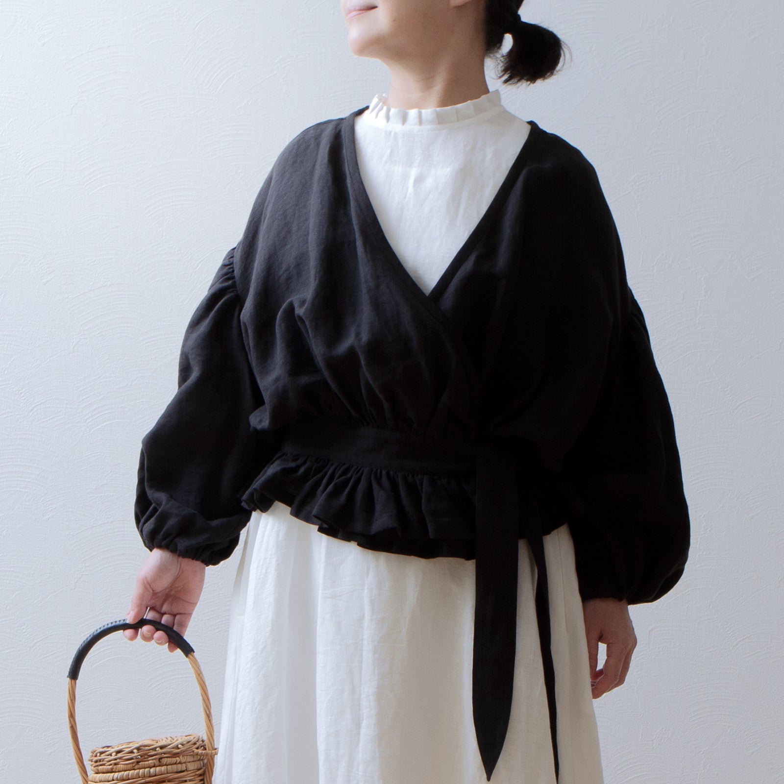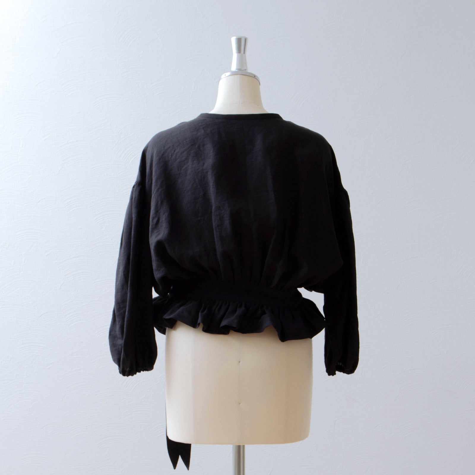 Cache-coeur 荷葉邊亞麻短上衣/黑色