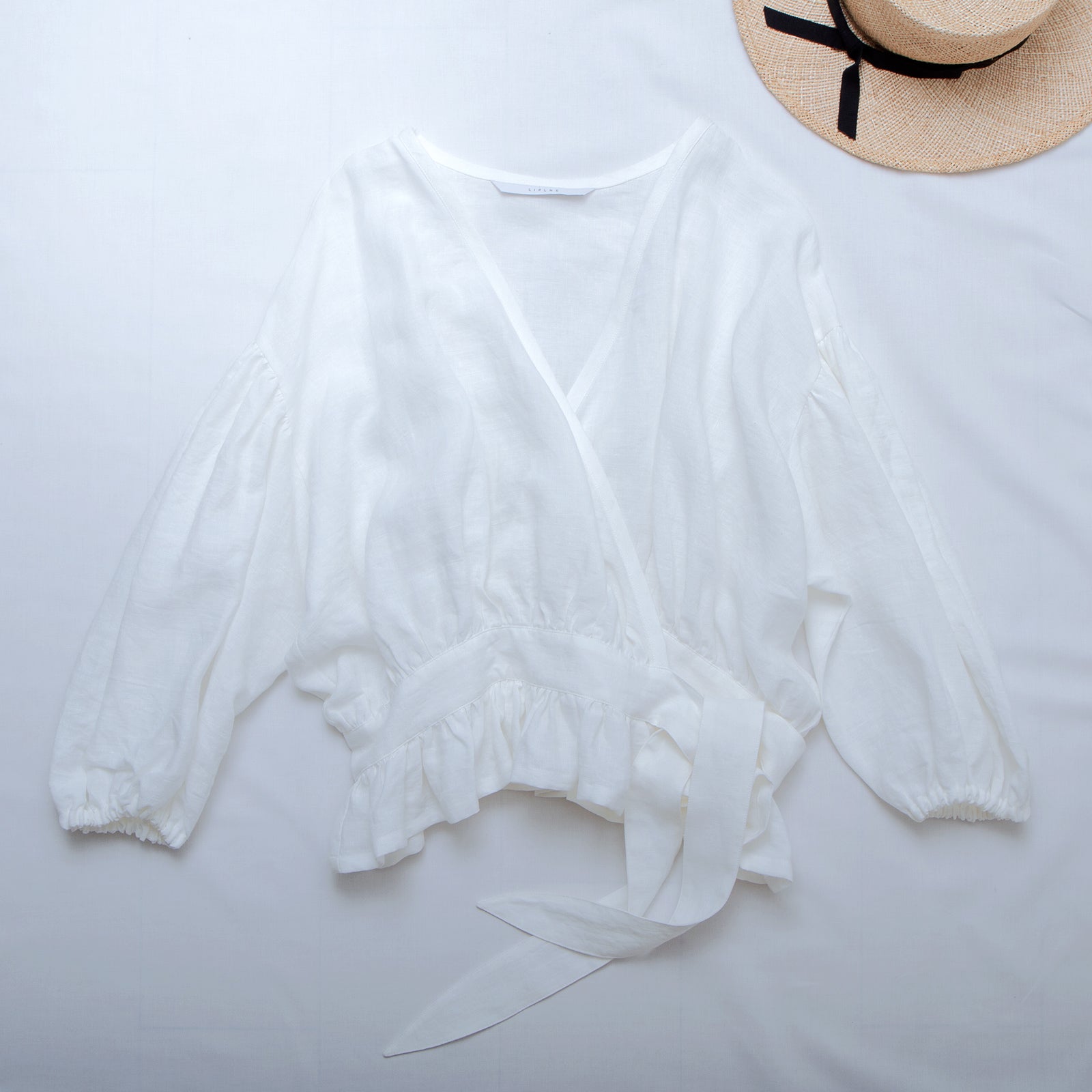 這款受歡迎的裹身式襯衫採用荷葉邊下擺設計,更加迷人。
