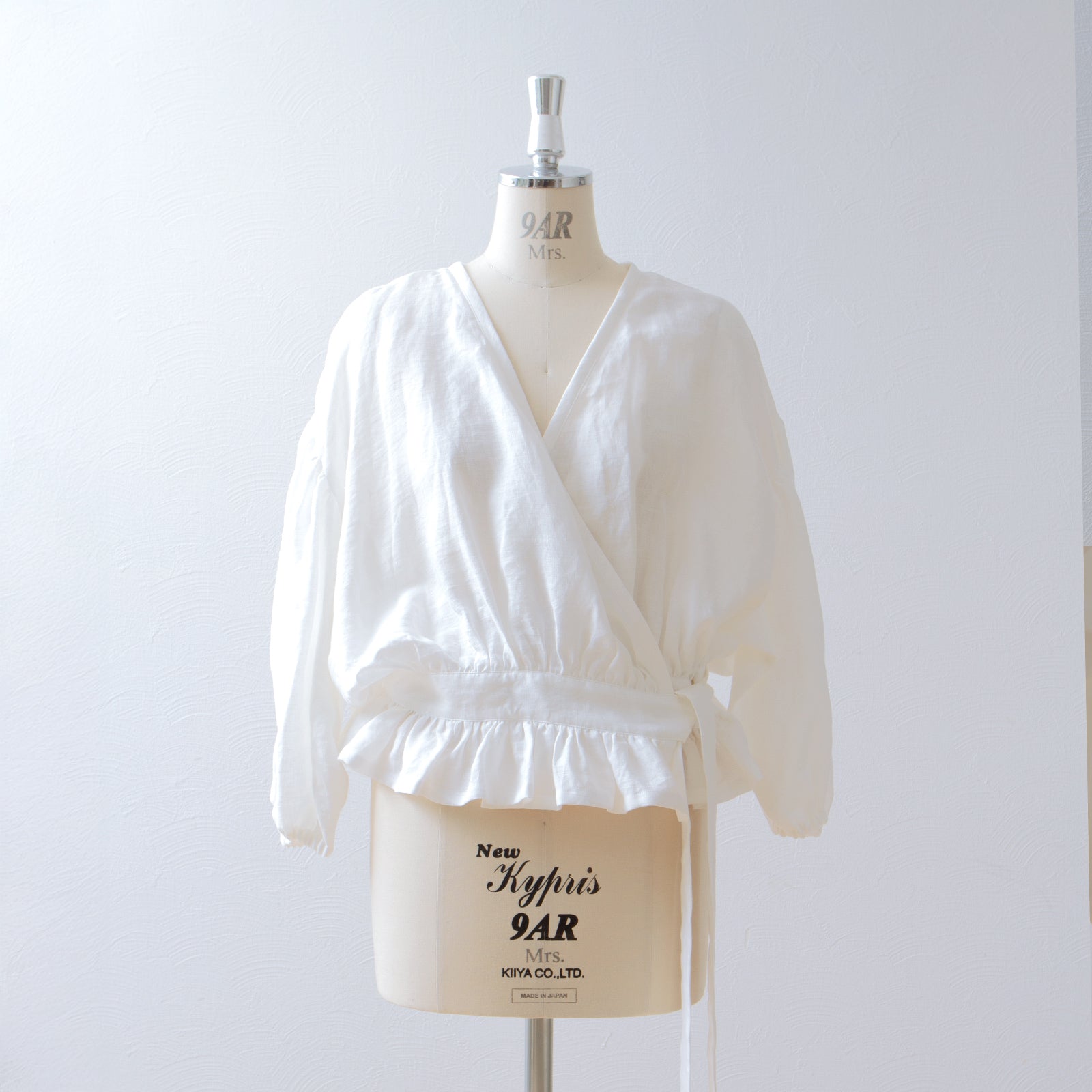 前部包裹、側邊絲帶腰帶以及柔和散開的褶邊營造出女性化、溫柔的外觀。