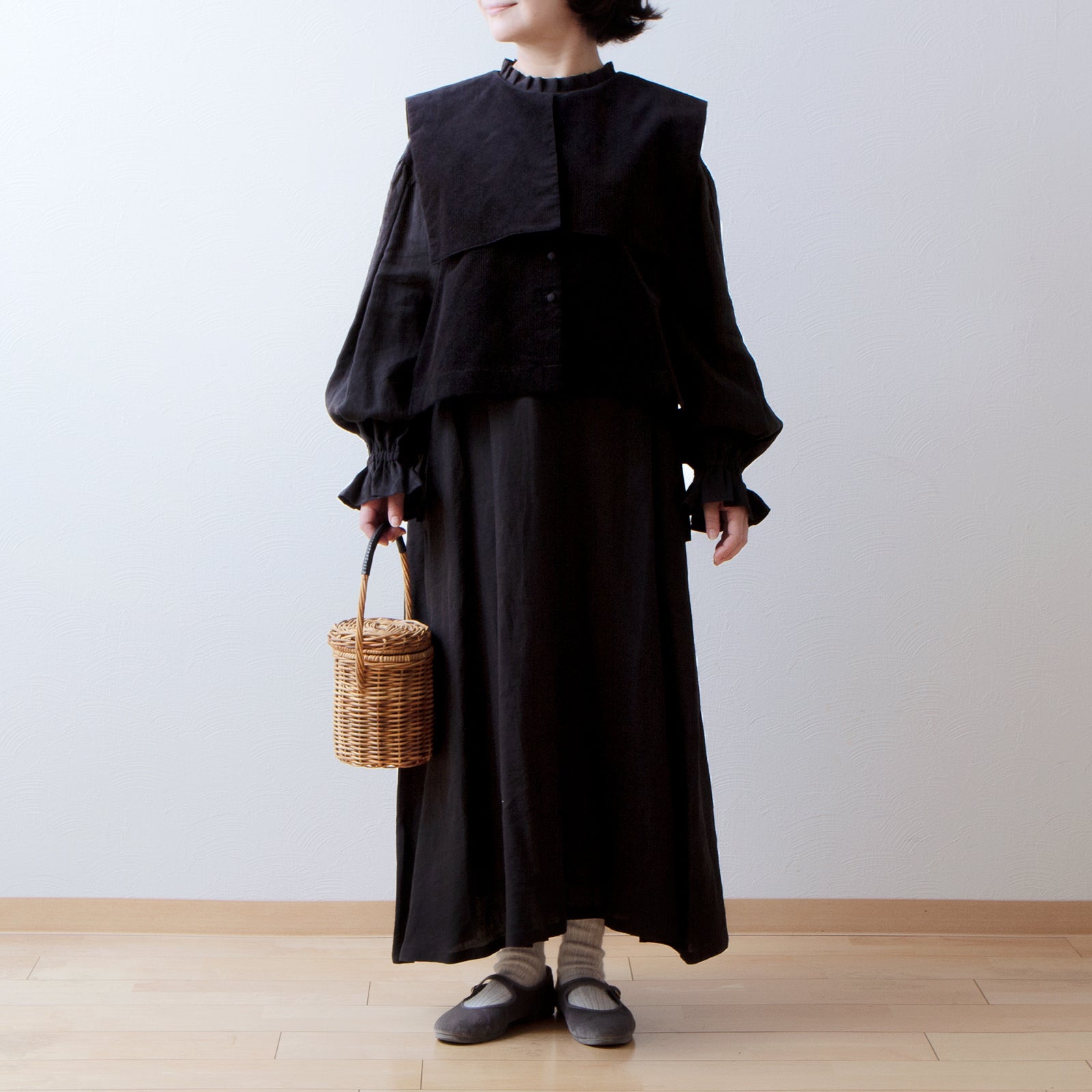 ・褶皺荷葉邊領長袖亞麻襯衫