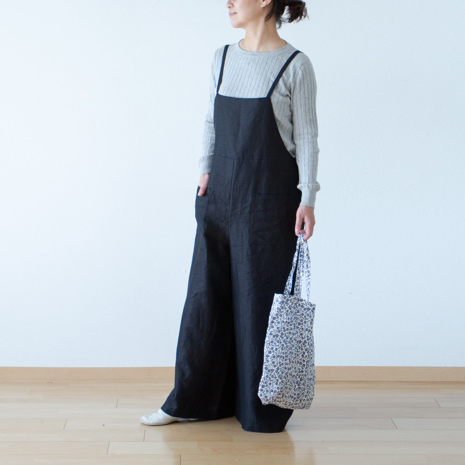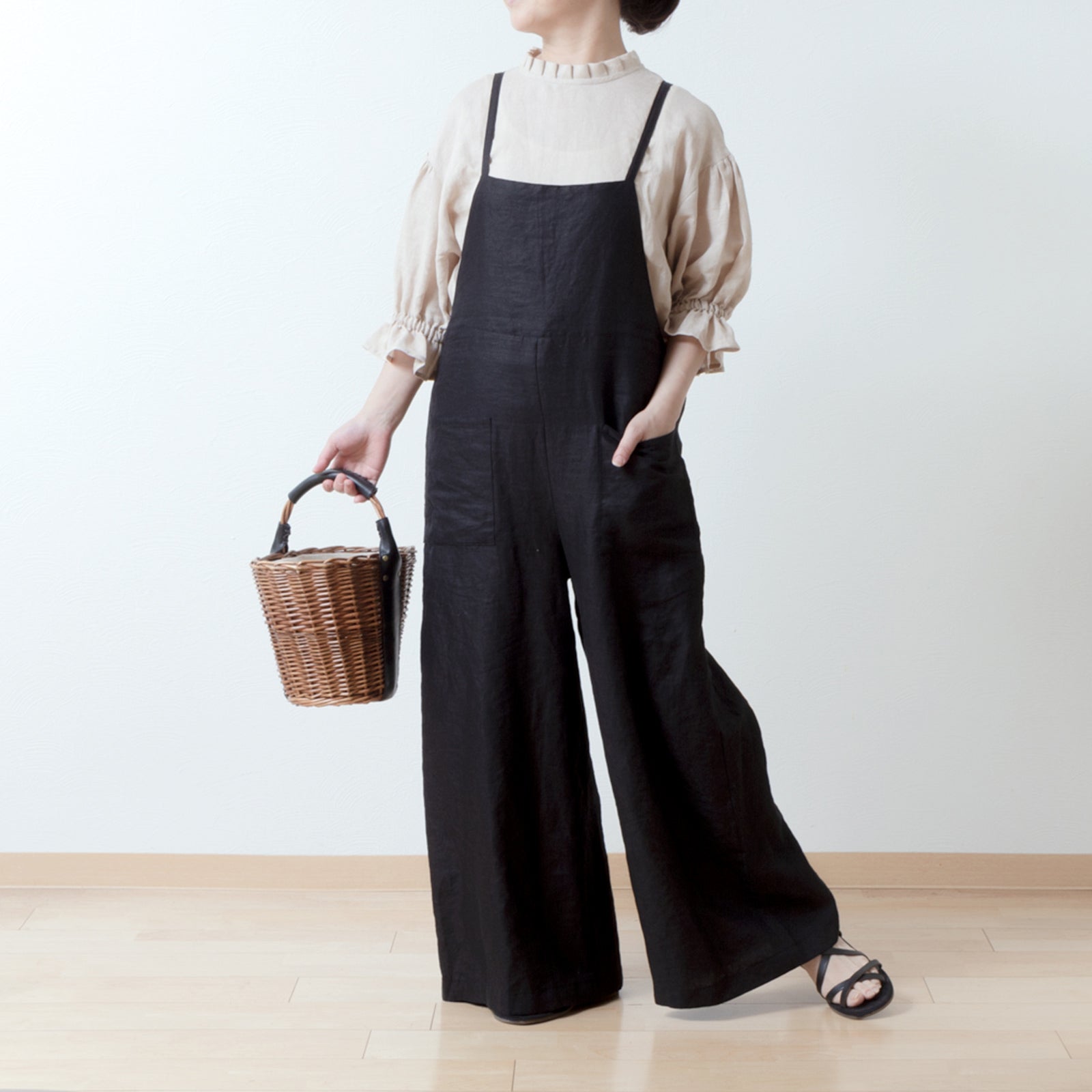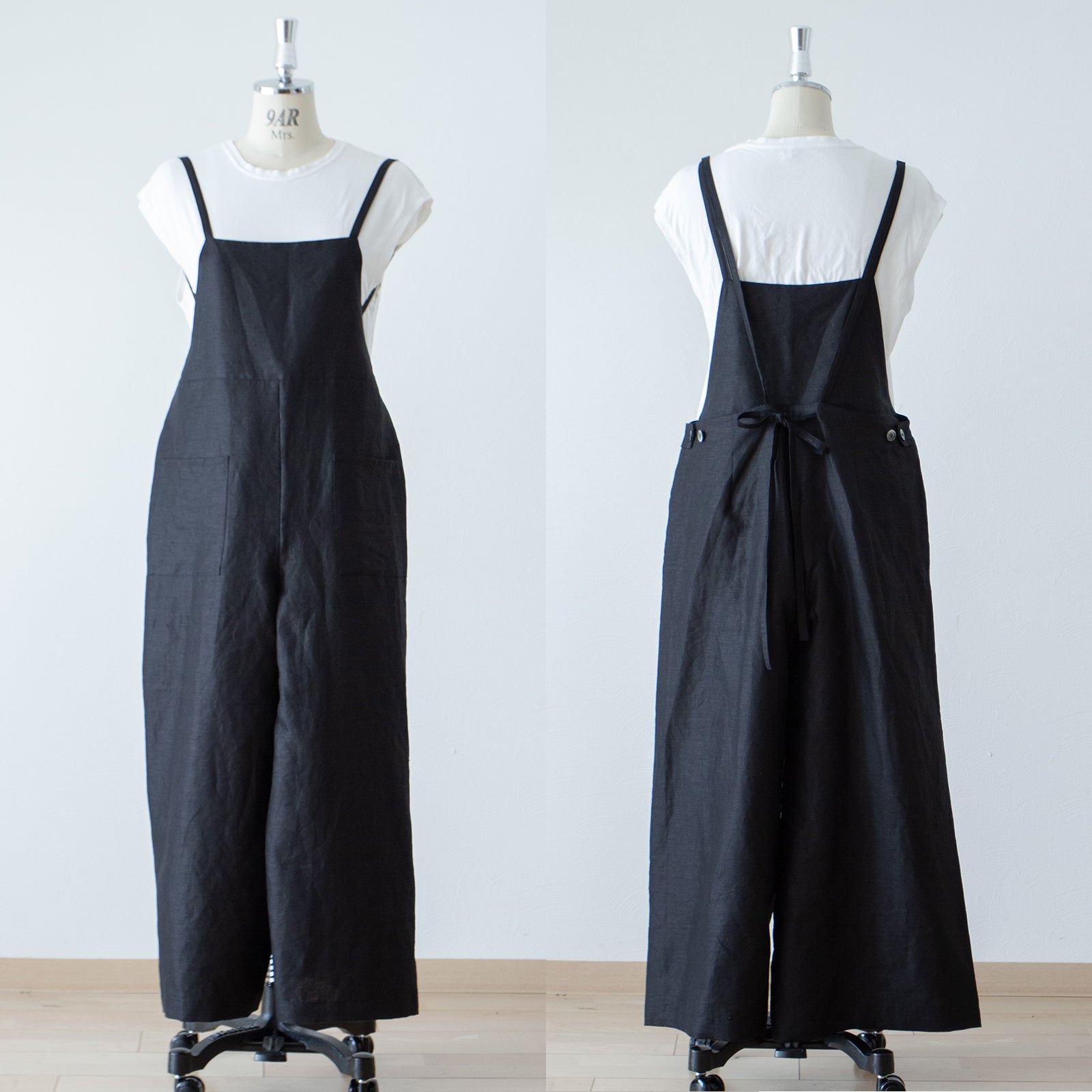 可愛而成熟的亞麻連身褲,從腰部到下擺呈 A 字形輪廓。