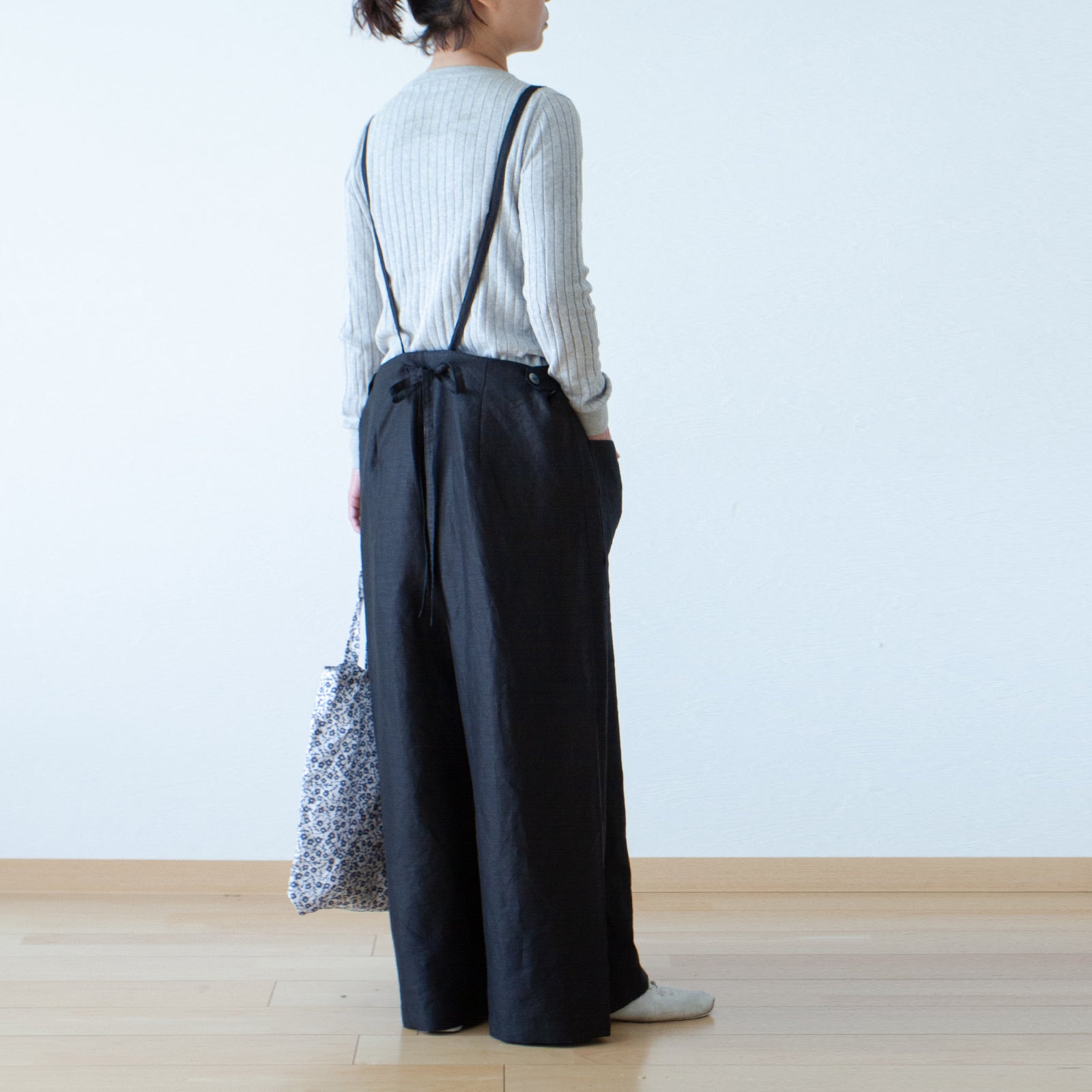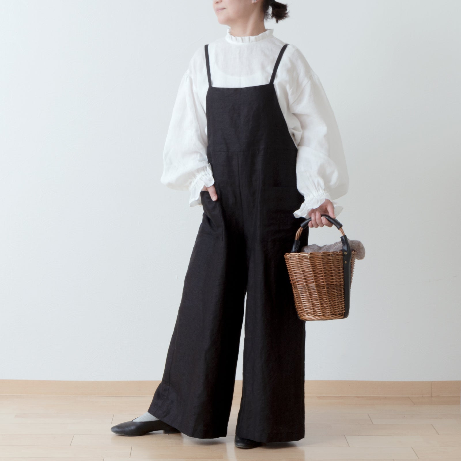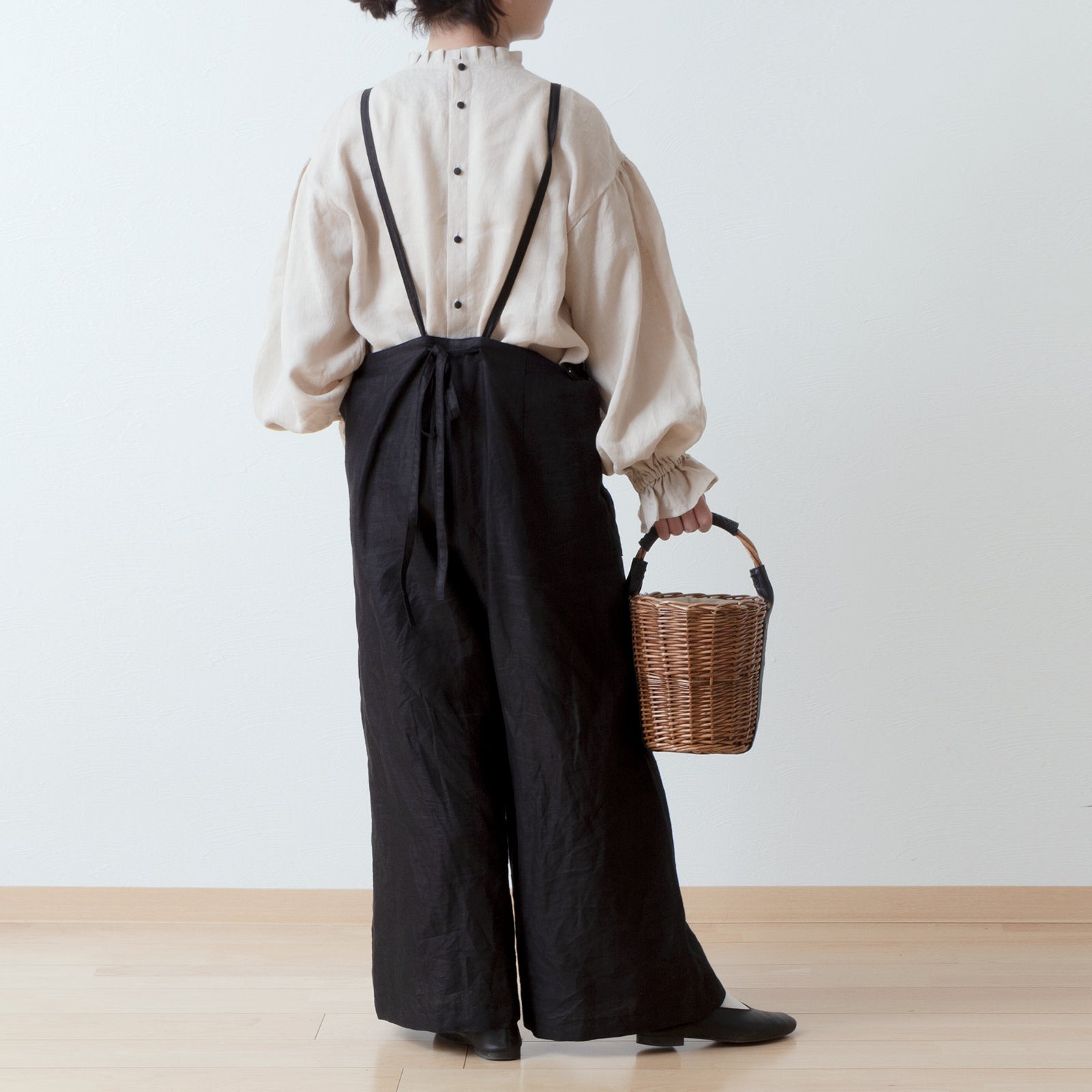 可愛而成熟的亞麻連身褲,從腰部到下擺呈 A 字形輪廓。
