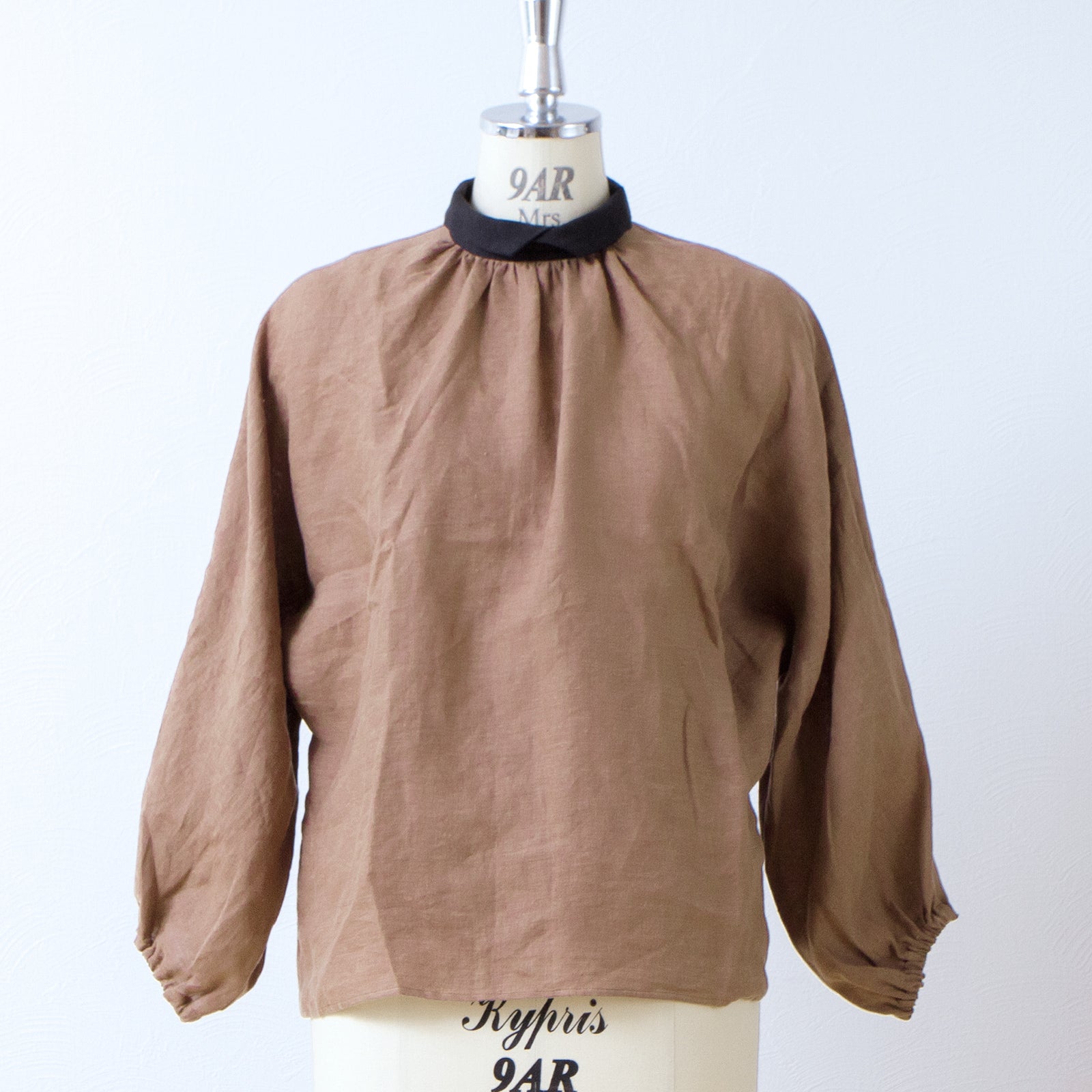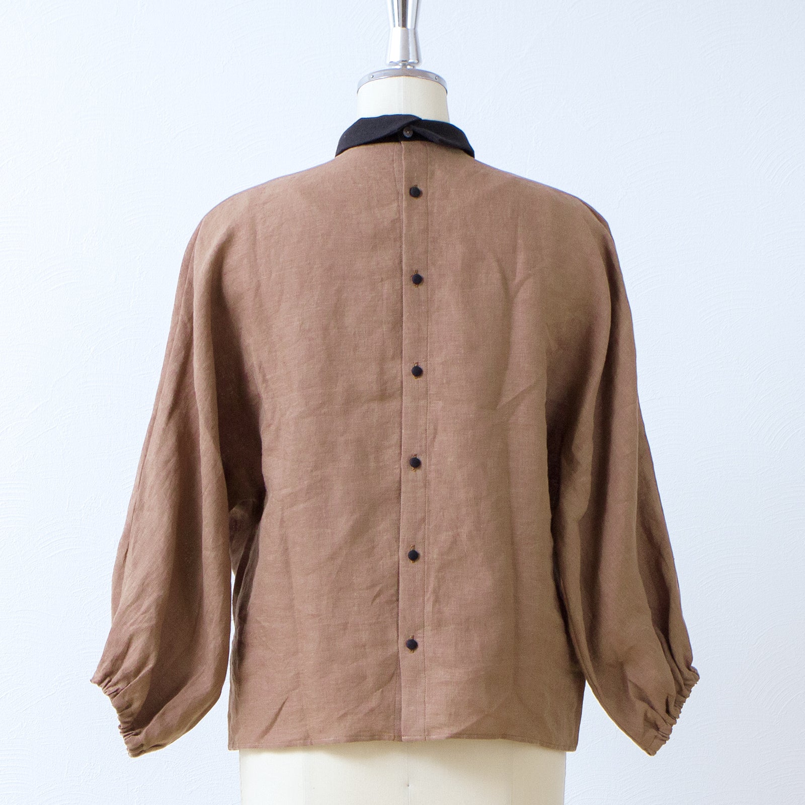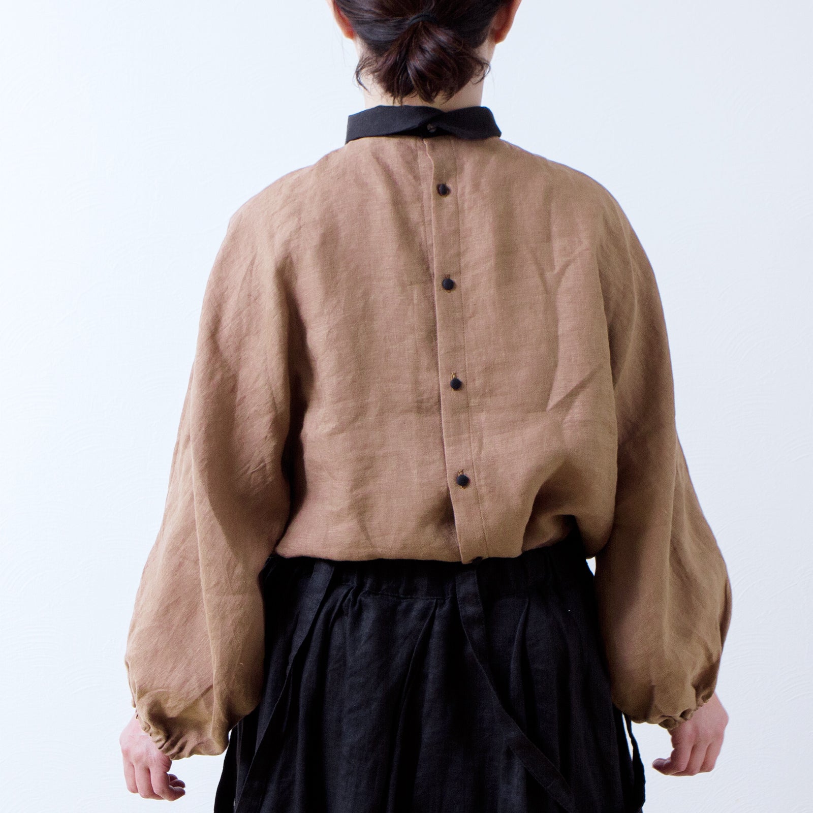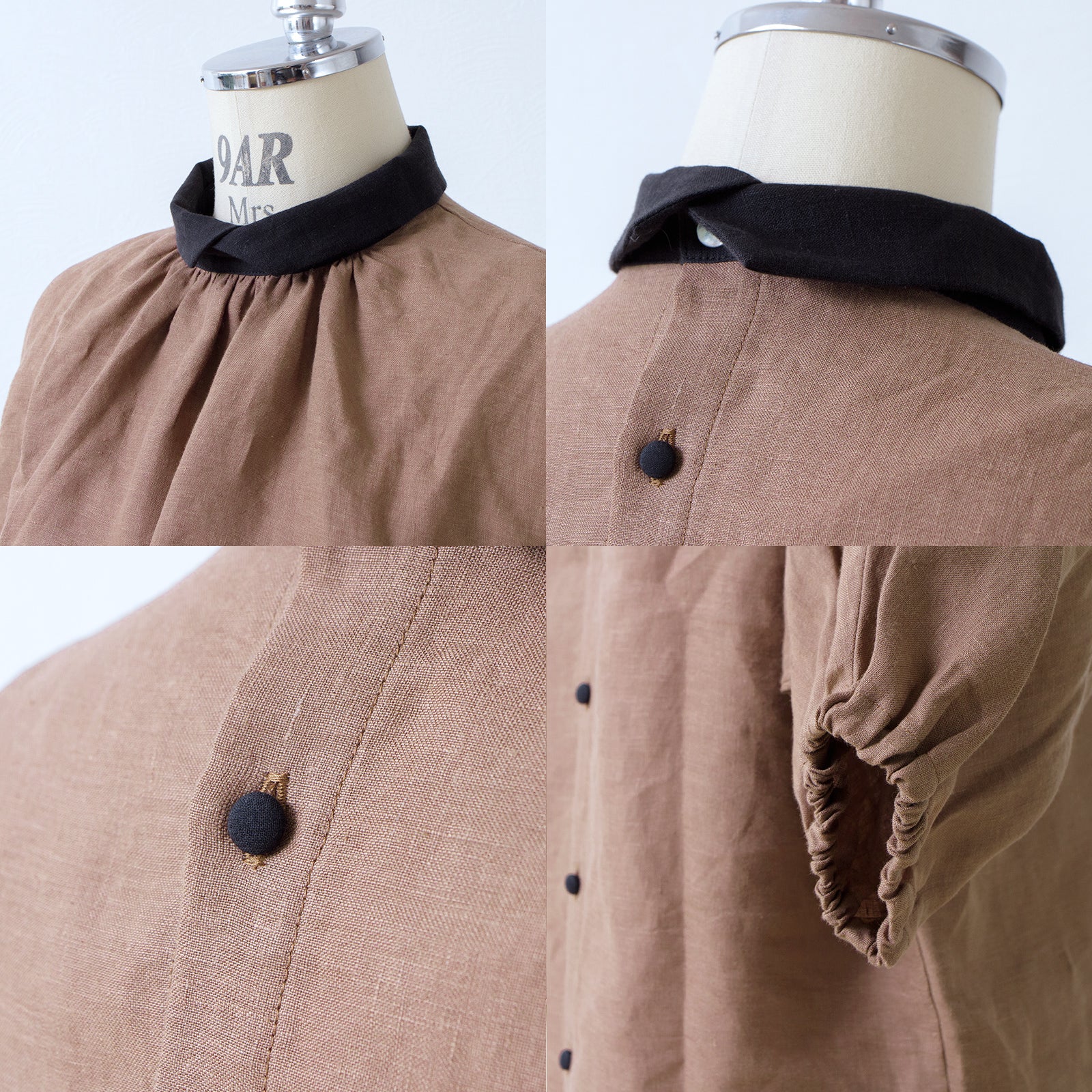牧師領優雅可愛,適合成人穿著。後背扣,寬袖法式亞麻襯衫,3/4袖/駝色牧師領