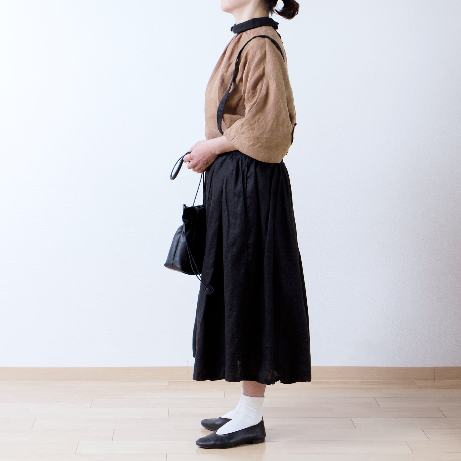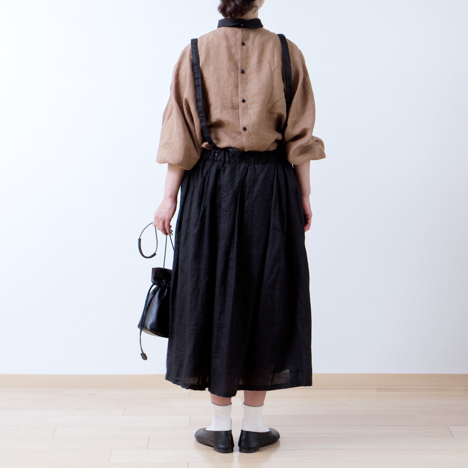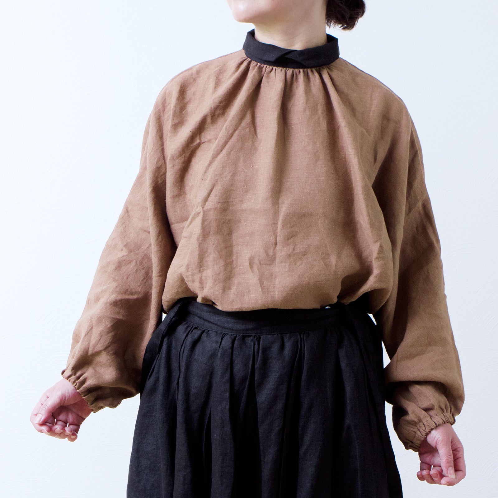牧師領優雅可愛,適合成人穿著。後背扣,寬袖法式亞麻襯衫,3/4袖/駝色牧師領